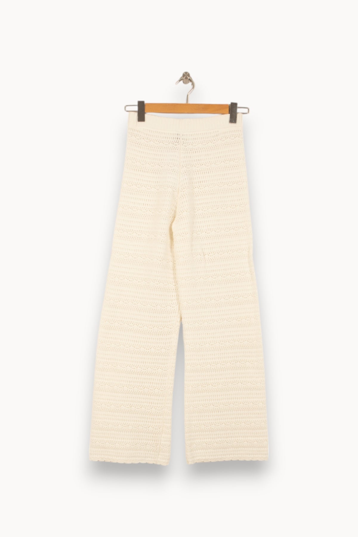 Pantalon crochet blanc Petite Mendigote en taille S/36, idéal pour une touche de fraîcheur élégante dans votre garde-robe. Confectionné dans une matière crochetée délicate et ajourée, ce pantalon séduit par ses finitions soigneusement travaillées et sa texture aérée, parfait pour un look authentique et raffiné. Parfait pour une promenade estivale en bord de mer ou une après-midi détente en terrasse.