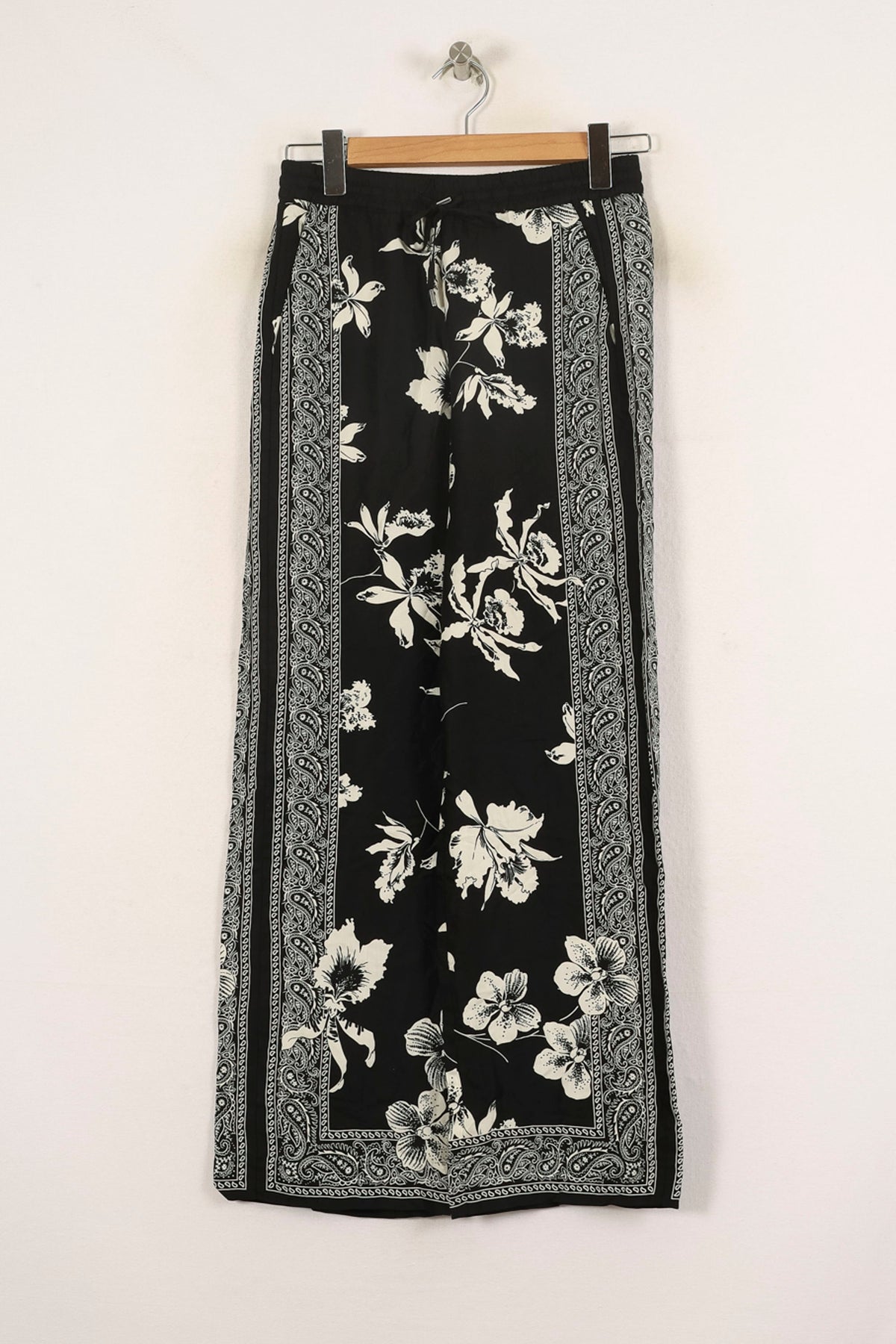 Pantalon fluide noir à imprimé floral The Kooples, taille XS/34. Confectionné dans une matière légère et agréable, ce pantalon se distingue par son imprimé floral blanc et ses motifs bordure effet foulard, apportant une touche raffinée et graphique. Idéal pour une sortie estivale ou un brunch chic en ville.