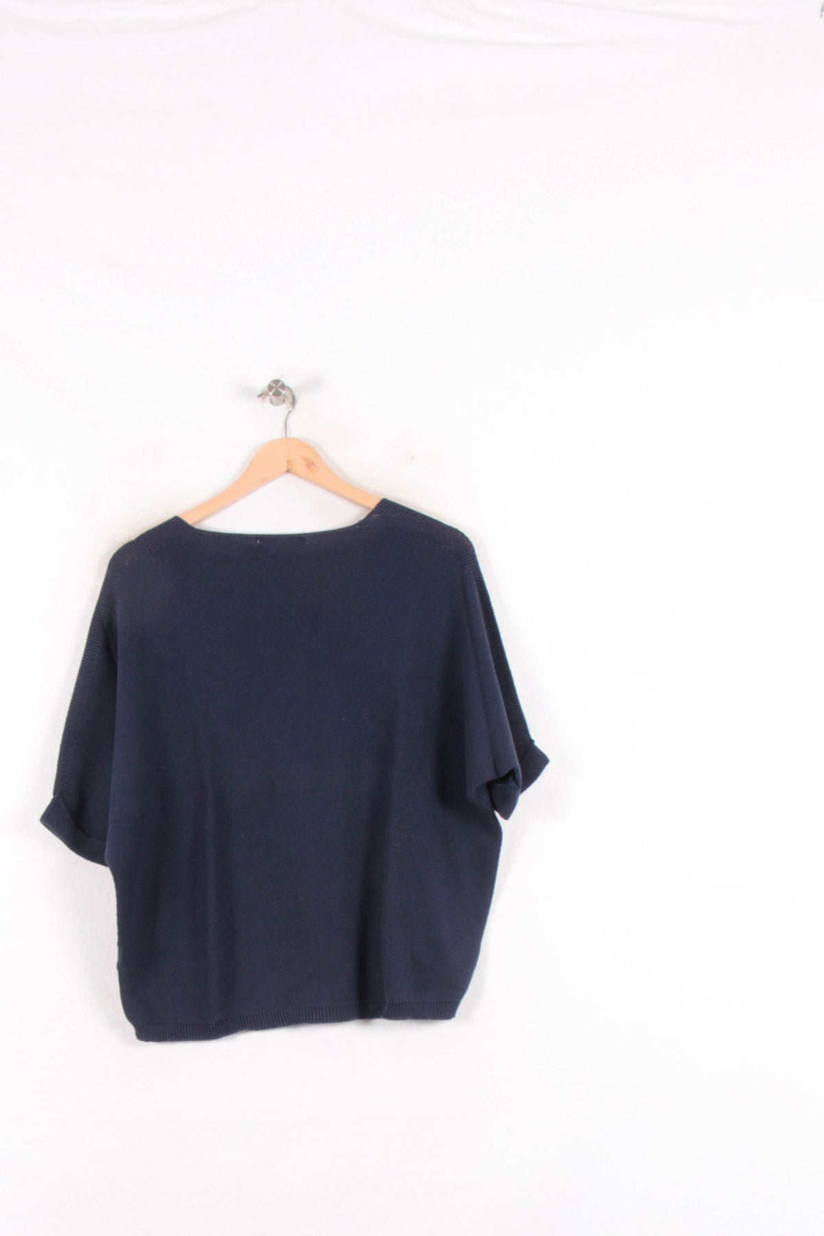 Pull bleu à manches courtes La Fée Maraboutée, taille S/36, au design sobre et élégant. Confectionné dans une maille fine avec une encolure en V et des manches larges légèrement retroussées, il se distingue par sa coupe ample et moderne. Idéal pour une tenue décontractée chic lors d’un déjeuner en ville ou d’une journée au bureau.