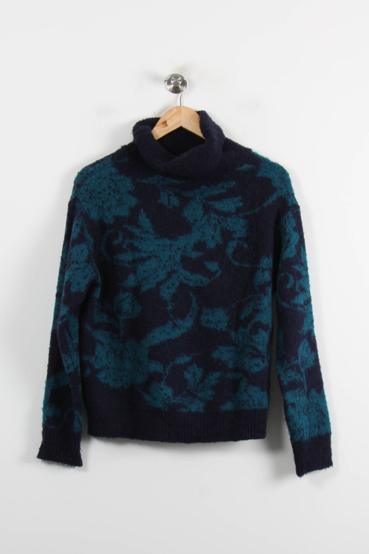 Pull col roulé multicolore La Fée Maraboutée, taille XS/34, affichant un élégant motif floral bleu canard sur fond bleu marine. Sa maille moelleuse et douce offre un confort optimal tandis que ses motifs contrastants et son col roulé apportent une touche sophistiquée et unique à cette pièce. Idéal pour une journée cocooning en hiver ou une sortie décontractée en ville.