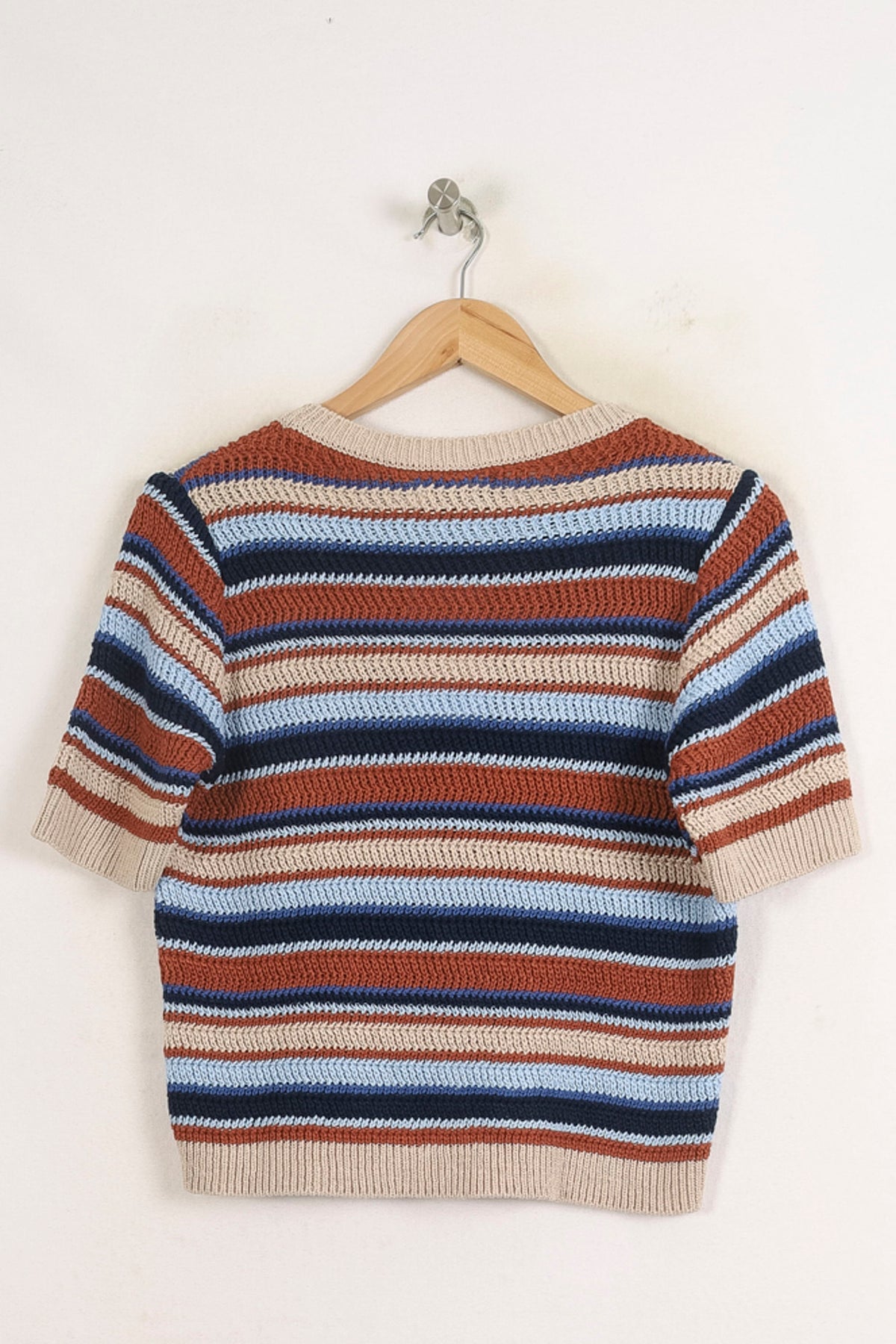 Pull rayé multicolore La Fée Maraboutée, taille M/38 – un vêtement à manches courtes à l’allure contemporaine. Tricoté dans une maille structurée, ce pull se distingue par ses rayures aux tons harmonieux et ses finitions contrastées aux poignets et à la taille, lui offrant un style à la fois moderne et raffiné. Idéal pour une journée décontractée ou un rendez-vous en ville, il apporte une note colorée et élégante à toutes vos tenues.
