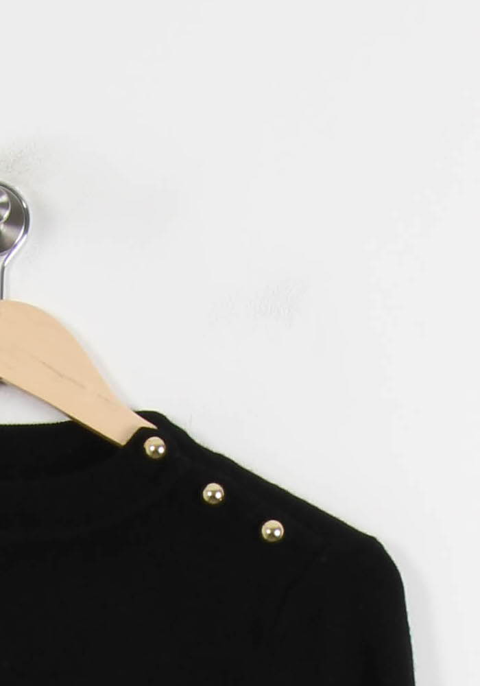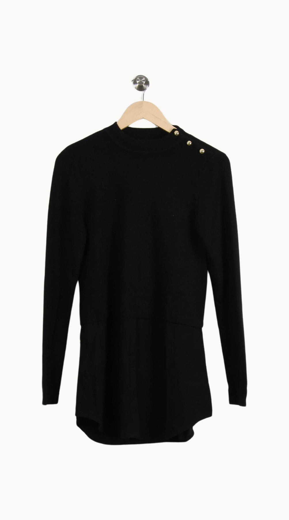 Pull noir Sandro, taille L/40, confectionné dans une maille fine et orné de boutons dorés à l’épaule pour une touche élégante et intemporelle. La matière douce assure un confort exceptionnel, tandis que la coupe légèrement asymétrique du bas et les détails de boutons ajoutent raffinement et singularité à ce modèle classique. Idéal pour une réunion professionnelle ou une sortie chic en soirée, il se porte facilement en toute occasion où une allure sophistiquée est de mise.