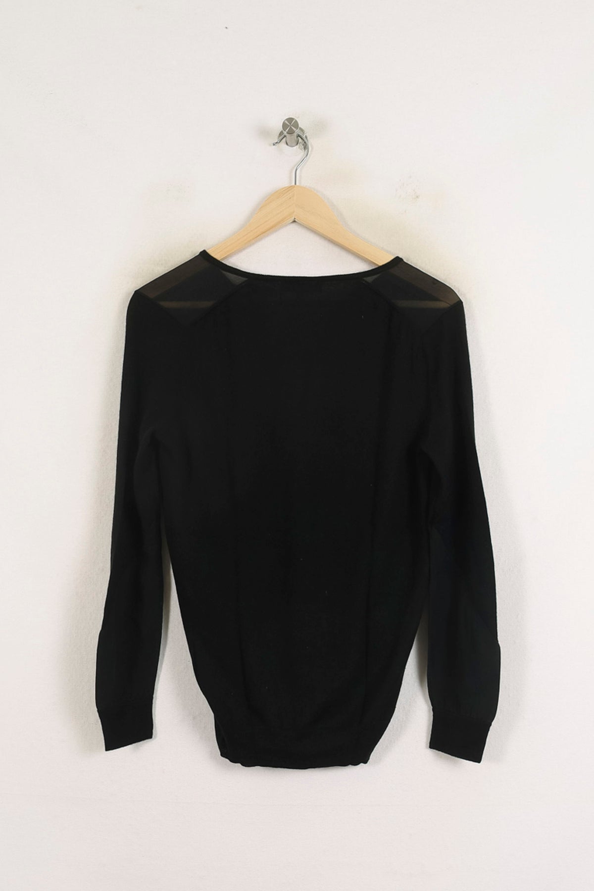Pull noir Sandro en taille S/36, élégant et intemporel, parfait pour compléter une garde-robe moderne. Sa matière fluide est mise en valeur par un empiècement en transparence délicate au niveau des épaules, apportant une touche sophistiquée et distincte à ce basique revisité. Idéal à porter lors d’un dîner chic ou au bureau pour un look raffiné et féminin.