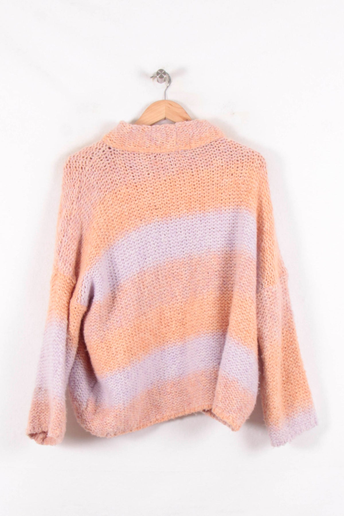 Pull oversize en maille La Fée Maraboutée, taille S/36, coloris orange pastel à rayures lavande, parfait pour sublimer votre garde-robe. Sa maille épaisse à l’aspect moelleux et ses teintes dégradées apportent douceur et originalité, tandis que les finitions larges du col et du bas du pull lui confèrent un look décontracté unique. Idéal pour une journée cocooning à la maison ou pour apporter une touche chaleureuse à une sortie en ville lors des fraîches journées d’automne.