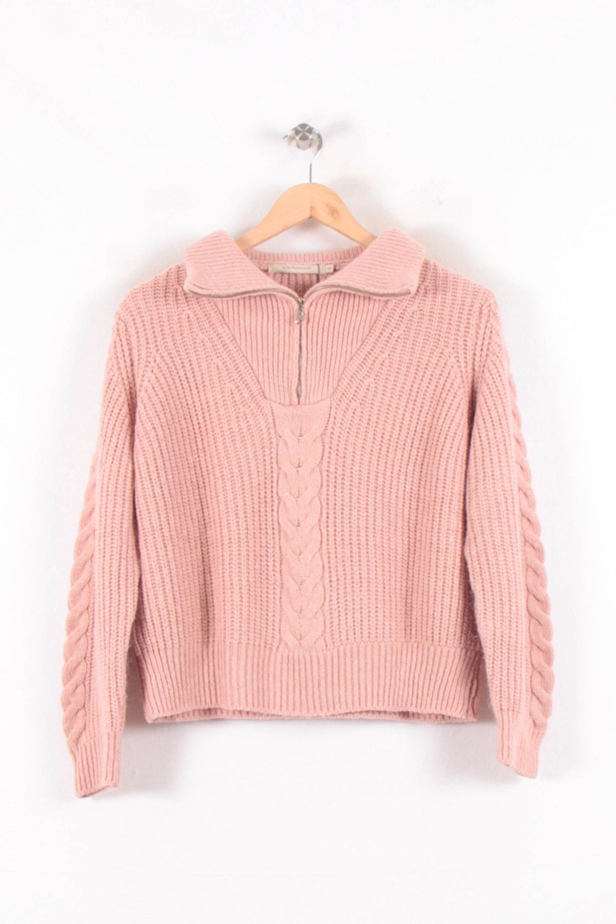 Pull torsadé rose La Fée Maraboutée, taille S/36, élégant et féminin, parfaitement adapté à la saison. Ce modèle en maille épaisse présente de jolis détails torsadés sur le devant et les manches, ainsi qu’un col zippé pour une touche moderne. Idéal pour une journée cocooning à la maison ou une sortie décontractée en ville.