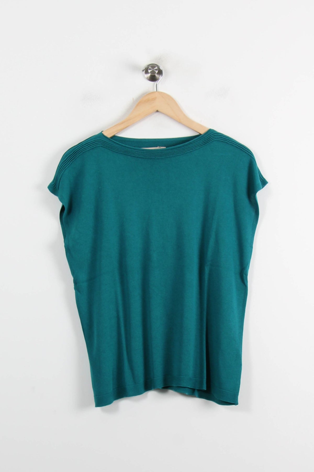 Pull vert La Fée Maraboutée, taille M/38, coupe ample à manches courtes, idéal pour un look élégant et décontracté. Confectionné dans une maille fine au toucher doux, il se distingue par les détails nervurés au niveau de l’encolure qui lui apportent une touche graphique raffinée. Parfait pour sublimer une journée de travail ou une sortie en ville avec un pantalon tailleur ou un jean.