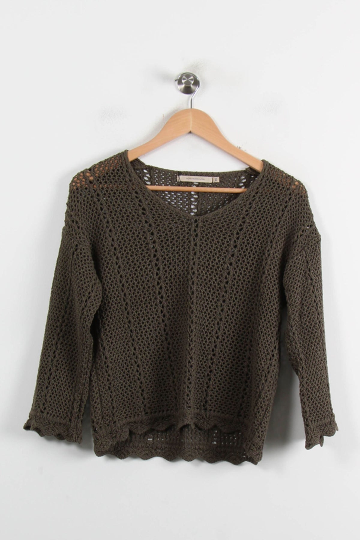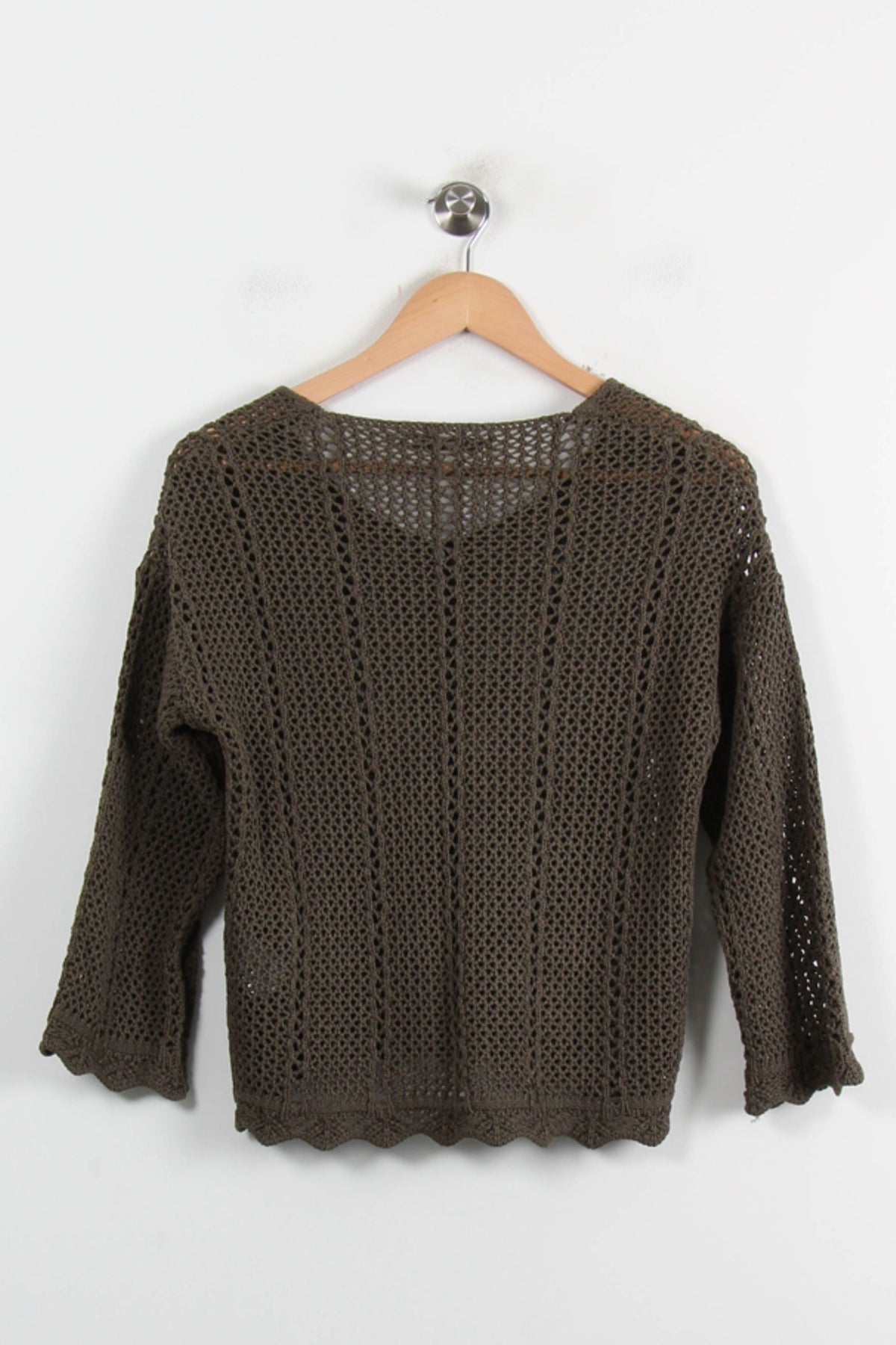 Pull ajouré vert La Fée Maraboutée, taille XS/34, parfait pour une allure élégante et décontractée. Tricoté dans une maille ajourée avec une finition festonnée en bas, ce modèle met en valeur un savoir-faire raffiné et une texture unique qui apporte une touche bohème au vêtement. Idéal pour une journée printanière, associé à un jean taille haute ou une jupe fluide lors d’une sortie détente entre amis.