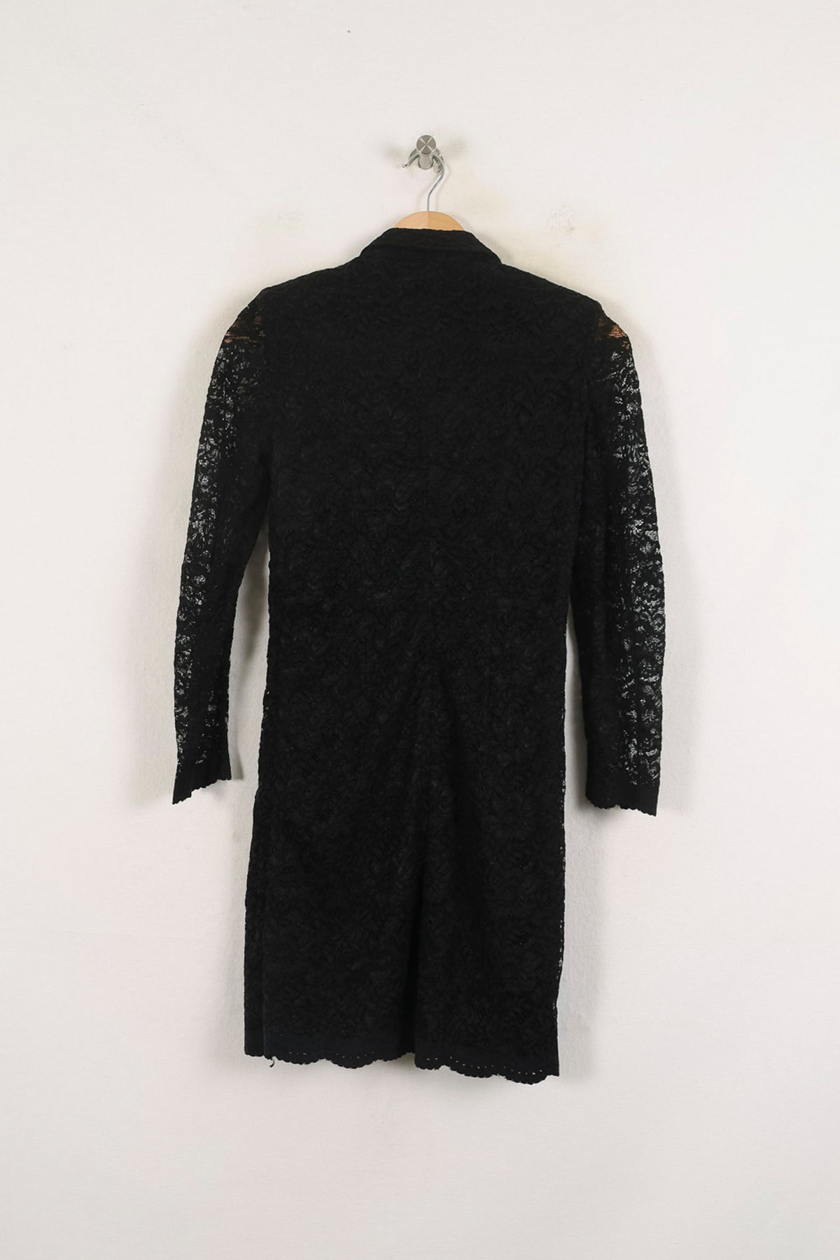 Robe blazer en dentelle noire The Kooples, taille S/36. Confectionnée en dentelle délicate, cette robe se distingue par sa coupe blazer croisée, ses boutons recouverts et ses manches longues entièrement transparentes, conférant un charme raffiné et contemporain à la pièce. Idéale pour une soirée élégante ou un cocktail, elle offre une allure sophistiquée et moderne.