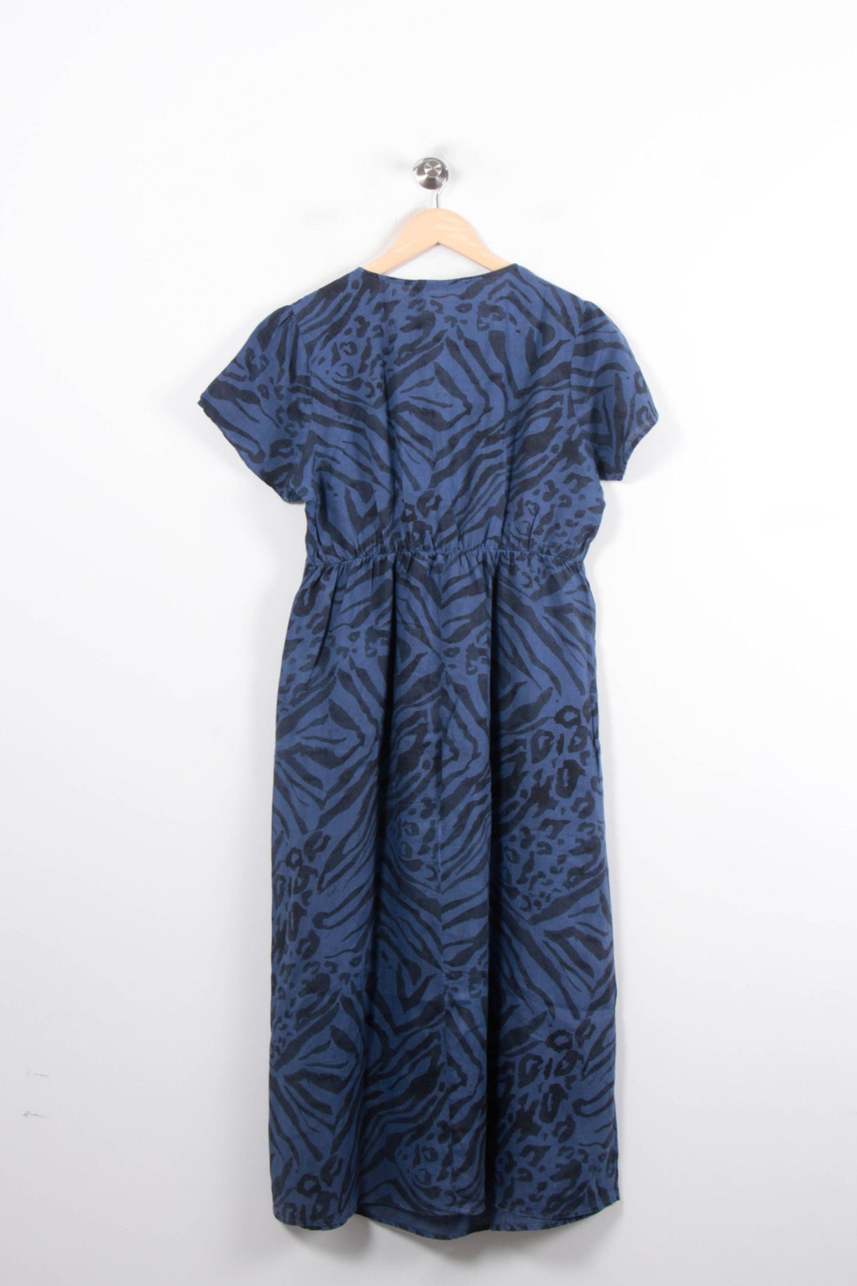 Robe longue bleu à imprimé animalier La Fée Maraboutée, taille L/40. Confectionnée dans une matière légère et fluide, cette robe se distingue par son motif audacieux aux accents zébrés et léopard, sa coupe flatteuse, ses manches courtes et son joli nœud sur le devant, apportant une touche d’originalité à l’ensemble. Parfaite pour une journée d’été, un déjeuner en terrasse ou une sortie citadine élégante.