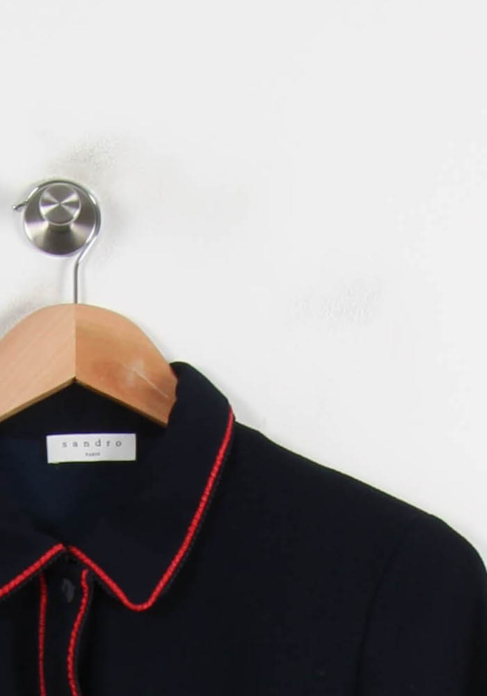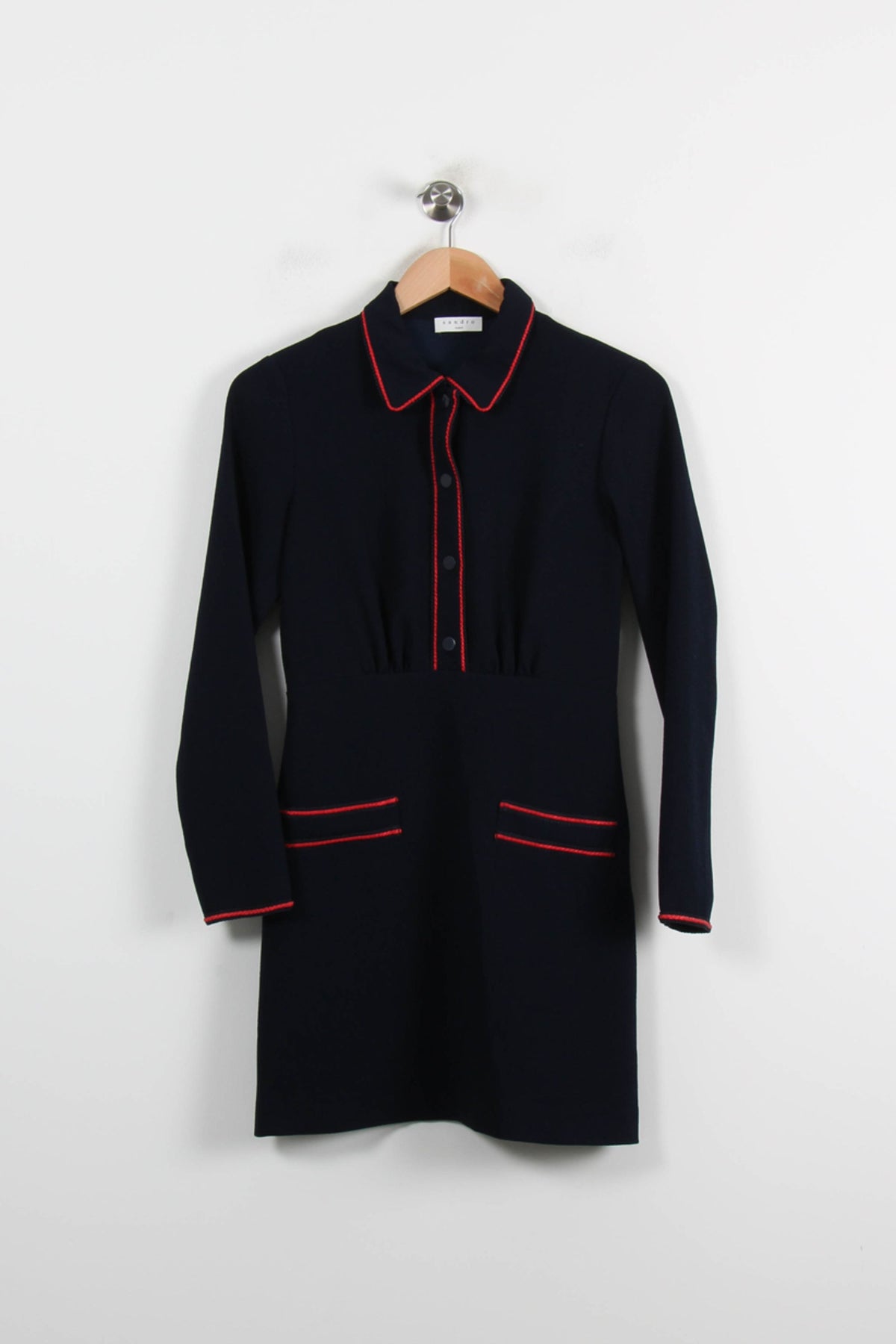 Robe bleue Sandro taille S/36, à manches longues, au design structuré et élégant, soulignée de détails contrastants rouges au col, à la patte de boutonnage, aux poches et aux poignets. Confectionnée dans une matière souple et agréable au toucher, cette robe se distingue par ses finitions contrastées qui lui apportent une touche d'originalité et d’élégance, ainsi que par son col chemise raffiné et ses poches à l’avant. Parfaite pour une journée au bureau suivie d’un afterwork chic ou une sortie citadine élégante.