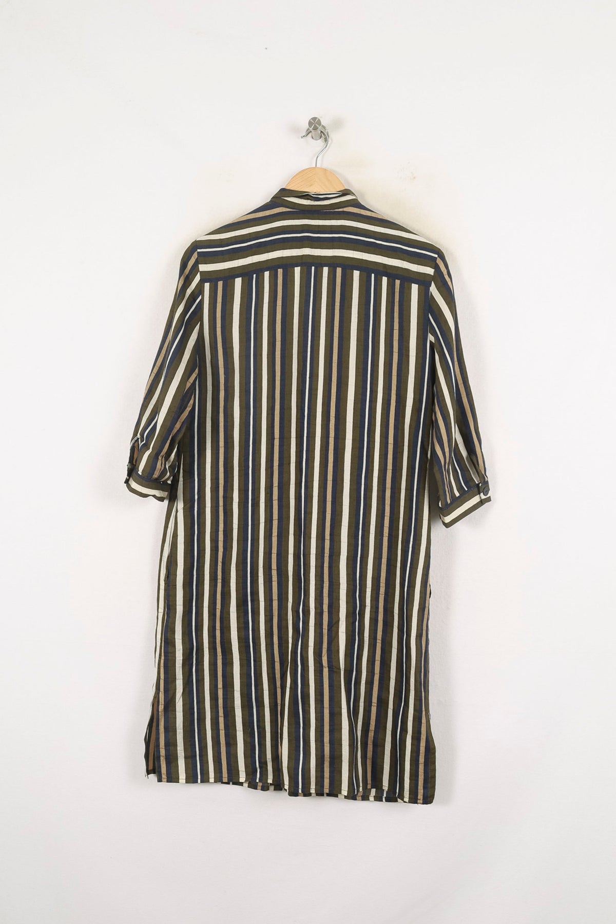 Robe chemise multicolore à rayures La Fée Maraboutée, taille M/38, au style graphique et contemporain. Confectionnée dans une matière fluide, elle se distingue par ses poches poitrine boutonnées et ses rayures verticales et diagonales qui apportent du caractère et une allure moderne. Parfaite pour une journée citadine ou un brunch entre amis.