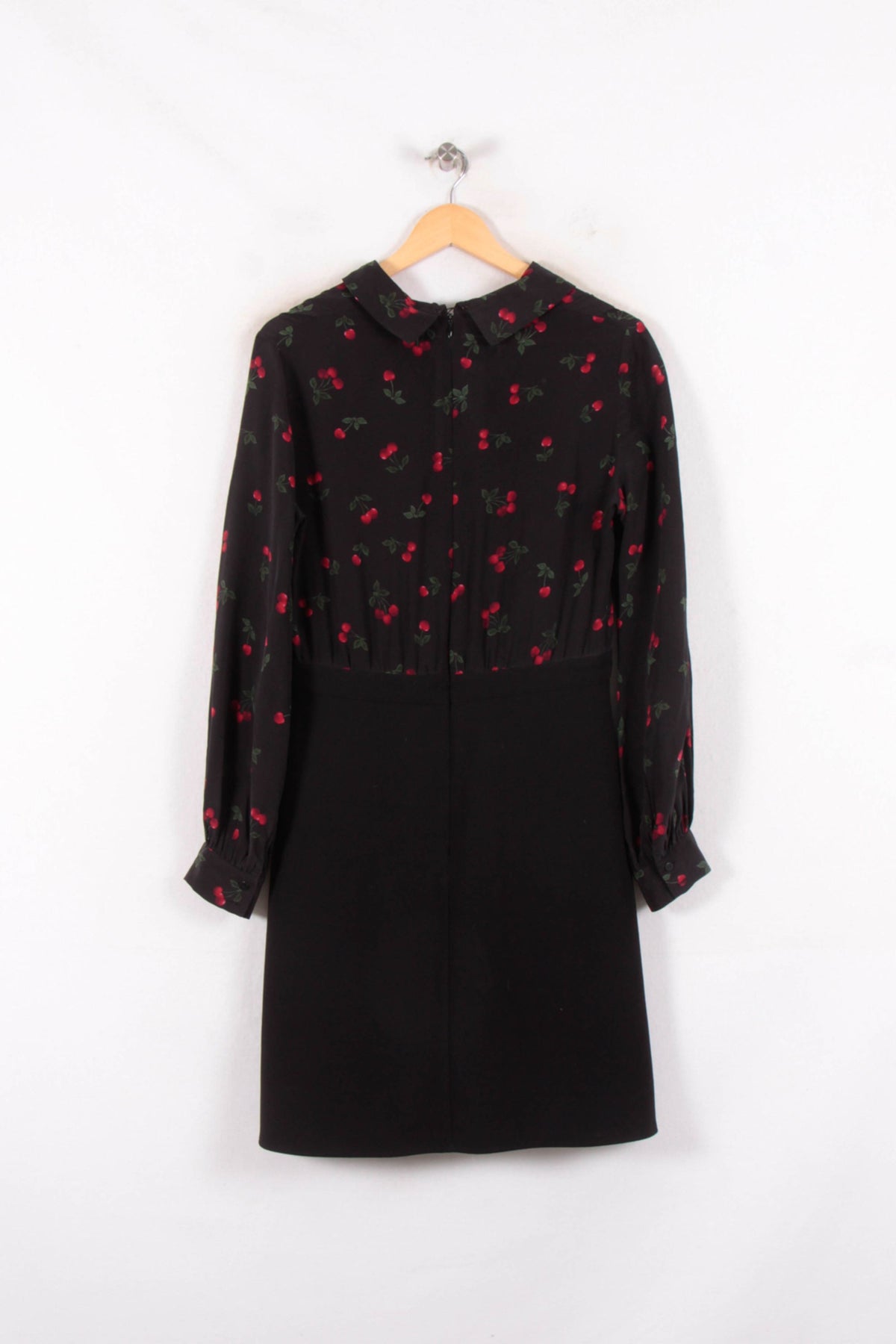 Robe noire The Kooples, taille L/40, au haut imprimé de cerises et col chemisier, idéale pour une allure féminine et contemporaine. Son haut fluide à motif cerises contraste élégamment avec la jupe unie, offrant un détail distinctif et raffiné qui structure la silhouette tout en ajoutant une touche d’originalité. Parfaite pour un déjeuner entre amies ou une journée au bureau, cette robe allie style décontracté et sophistication.
