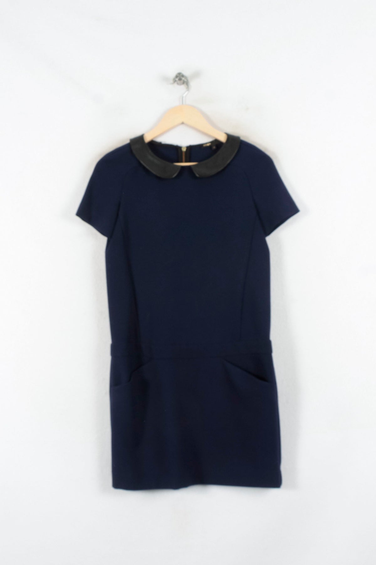 Robe courte bleu marine Maje, taille S/36, à col Claudine contrastant, manches courtes et coupe droite. Confectionnée dans une matière structurée, cette robe se distingue par son col Claudine en contraste, ajoutant une touche raffinée et originale à la silhouette épurée. Idéale pour un rendez-vous professionnel ou un cocktail chic en soirée.