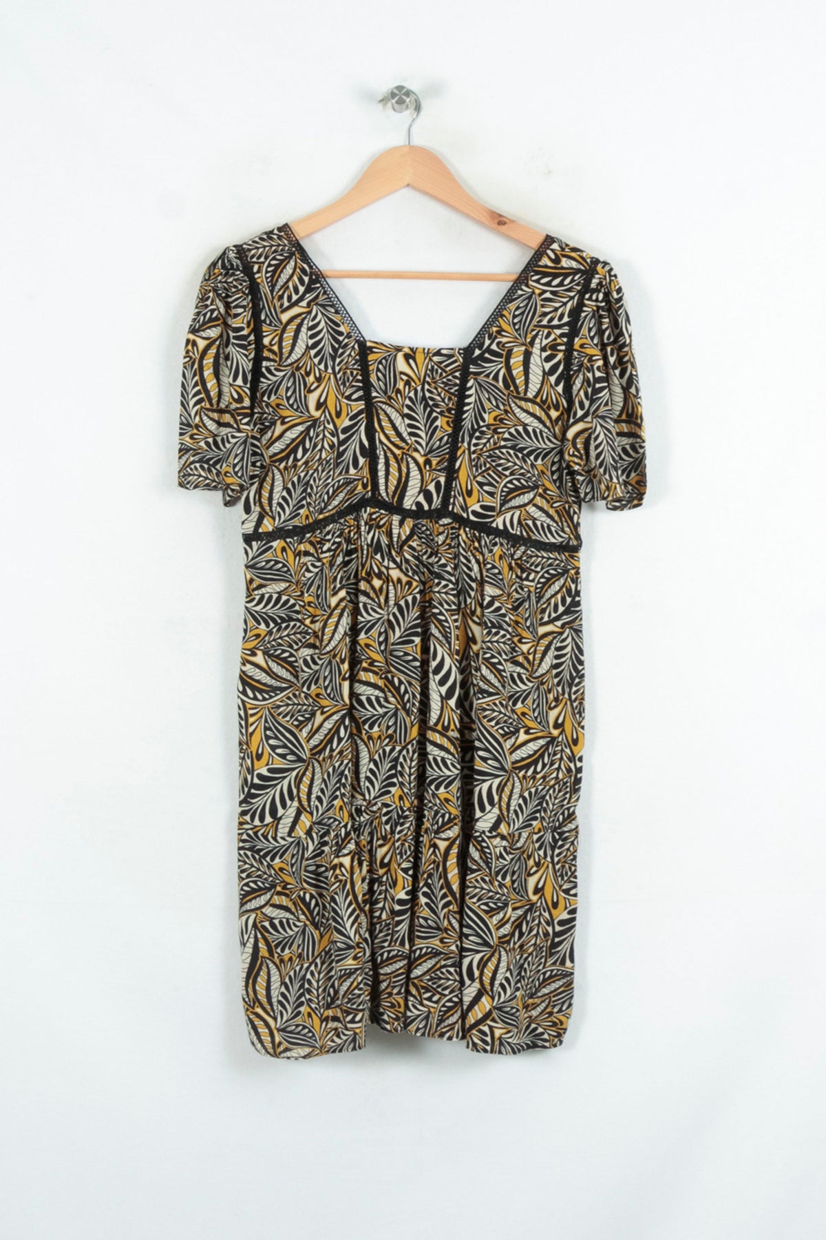 Robe multicolore à imprimé feuillage Bérénice, taille M/38, au style raffiné et contemporain. Confectionnée dans une matière fluide, elle se distingue par son motif végétal graphique aux touches de jaune, noir et crème, ainsi que ses détails de galon noir soulignant le buste et l'encolure carrée, offrant une allure unique et élégante. Parfaite pour une sortie estivale ou un brunch entre amis, cette robe apporte une touche d’originalité à votre garde-robe.