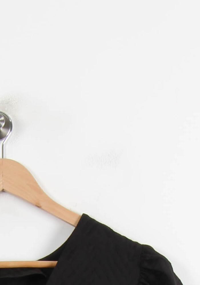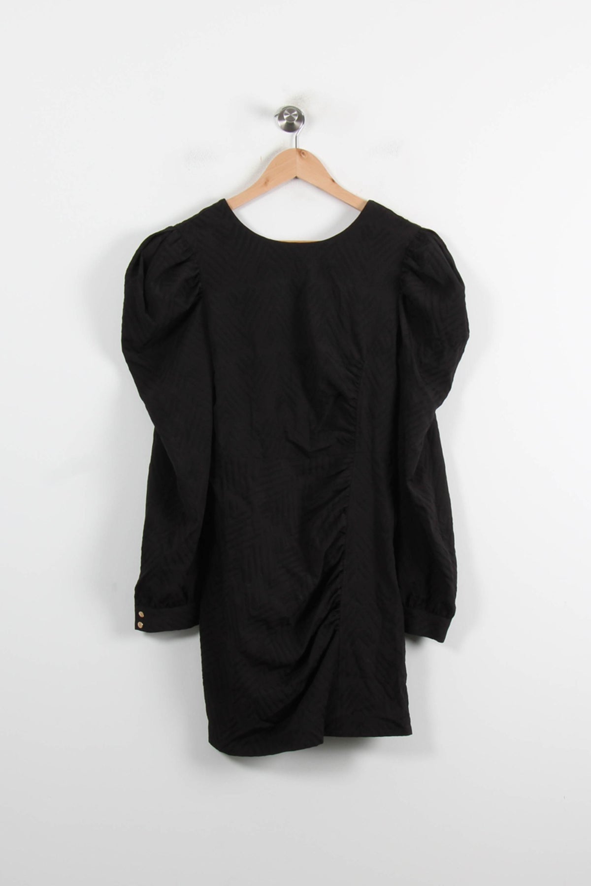 Robe noire Bérénice, taille S/36, à manches longues et coupe légèrement ample, idéale pour une allure élégante et moderne. Le tissu présente un subtil motif ton sur ton en chevrons, offrant une texture raffinée, tandis que les manches longues à boutons dorés ajoutent une touche sophistiquée. Parfaite pour un dîner chic ou un événement professionnel où élégance discrète et confort sont de mise.