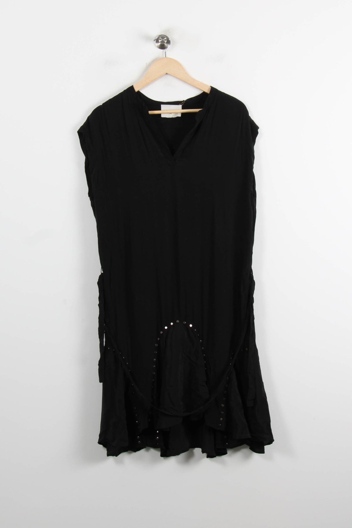 Robe noire Bérénice en taille S/36, à la coupe fluide et à encolure en V. Cette robe se distingue par sa matière légère et ses détails de petits clous argentés disposés sur le bas, offrant une touche d’originalité subtile à la pièce. Idéale pour une soirée estivale ou un événement chic en toute simplicité.
