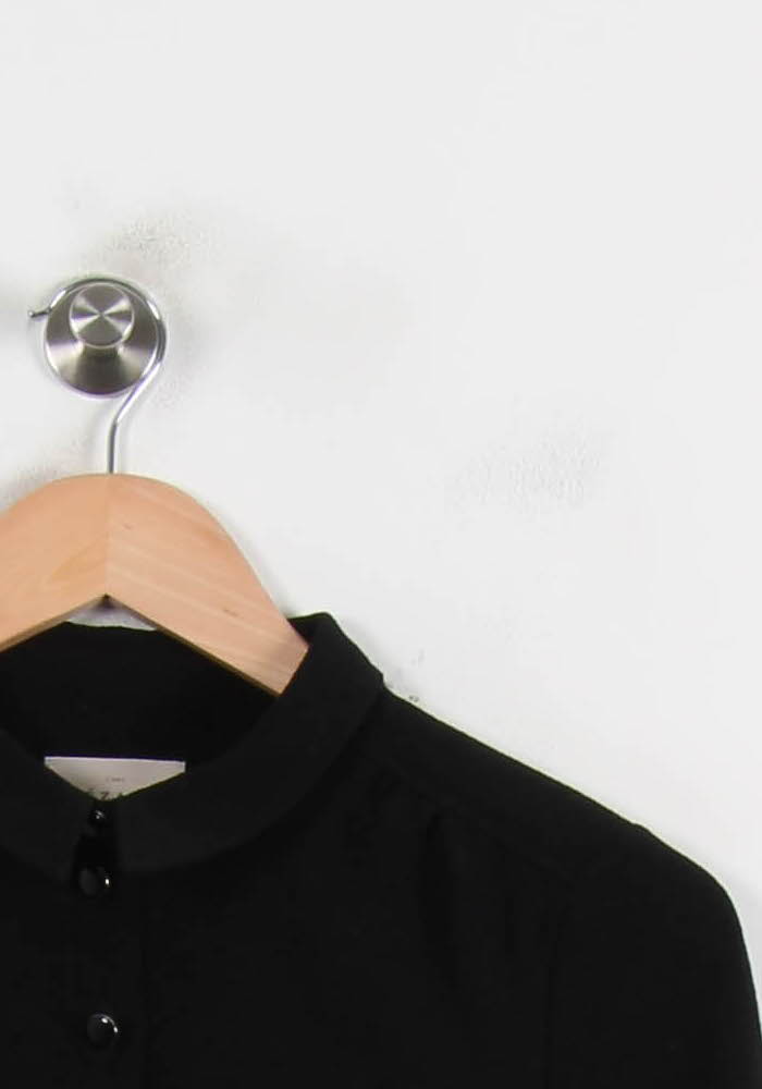 Robe noire Sézane en taille XS/34, à manches longues et col montant boutonné. Confectionnée dans une matière fluide, cette robe présente des finitions soignées et une patte de boutonnage centrale qui lui apportent raffinement et caractère. Idéale pour un dîner élégant ou une soirée habillée.