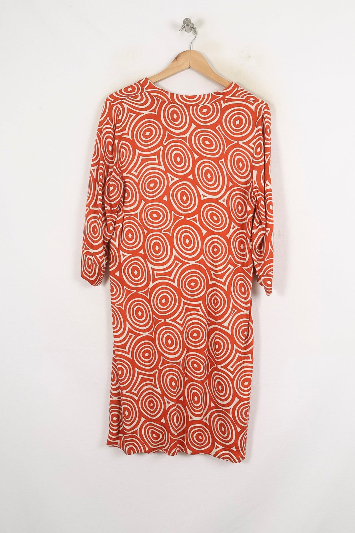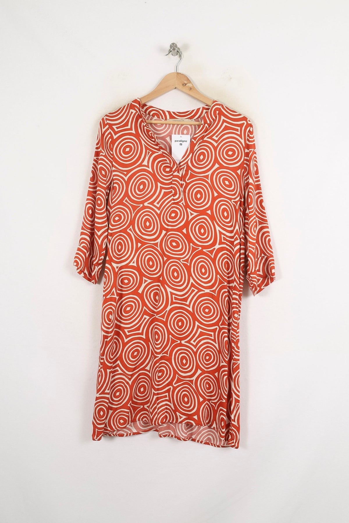 Robe orange à motifs géométriques, taille L/40, signée La Fée Maraboutée. Son tissu fluide est sublimé par un motif graphique blanc sur fond orange apportant une touche moderne et audacieuse ; l'encolure en V et les manches 3/4 soulignent une allure décontractée mais élégante. Idéale pour une journée estivale, un déjeuner en terrasse ou une sortie citadine décontractée.