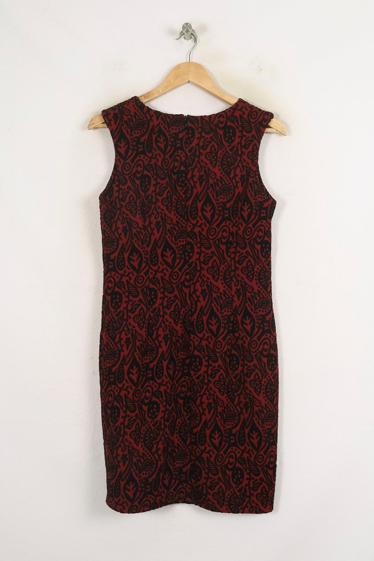 Robe droite bordeaux à motifs graphiques noirs La Fée Maraboutée, taille L/40, idéale pour une allure contemporaine et raffinée. La matière semble épaisse et structurée, mettant en valeur un motif original et audacieux qui confère à la pièce tout son caractère et son unicité. Parfaite pour un dîner chic ou un événement en soirée où distinction et élégance sont de mise.