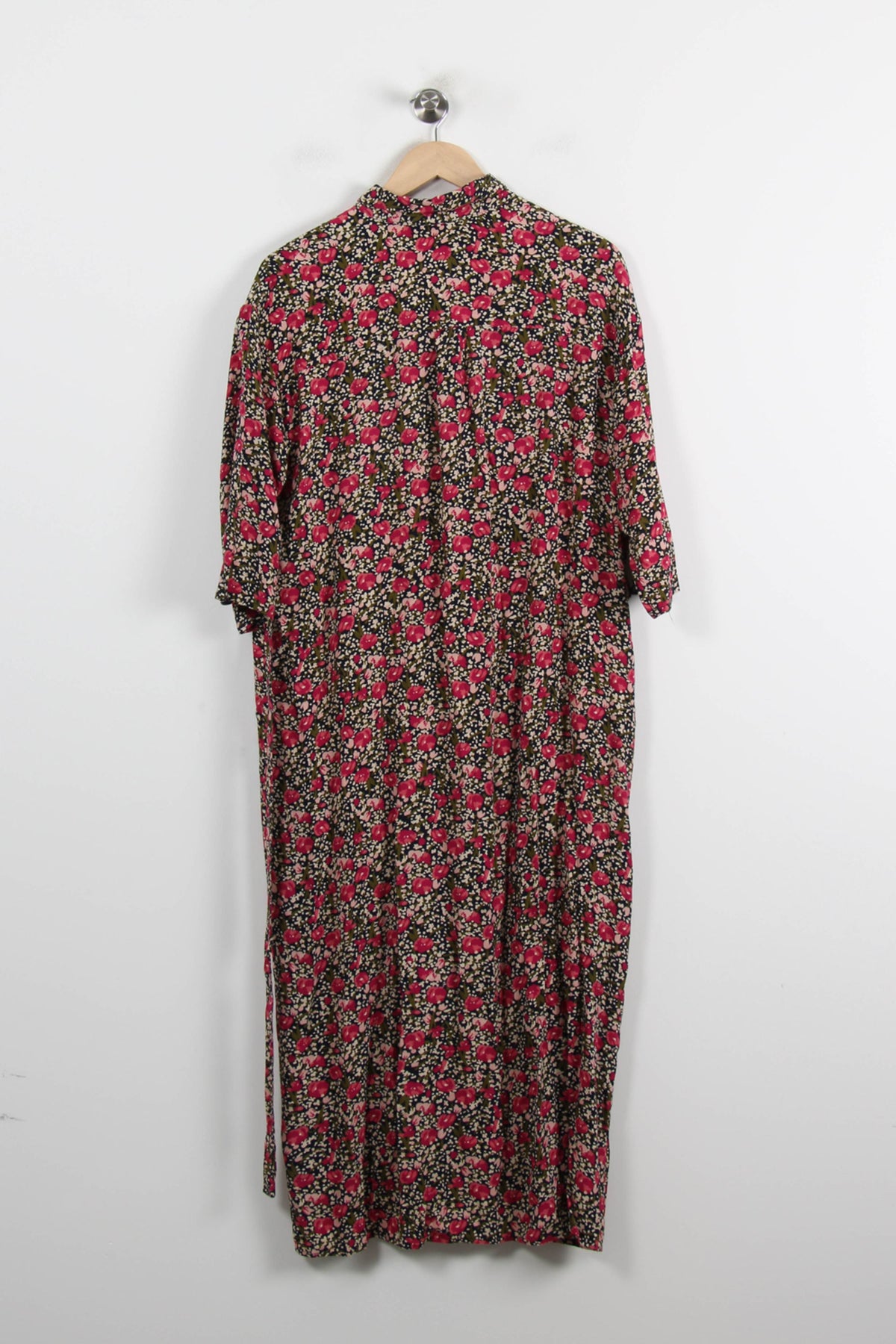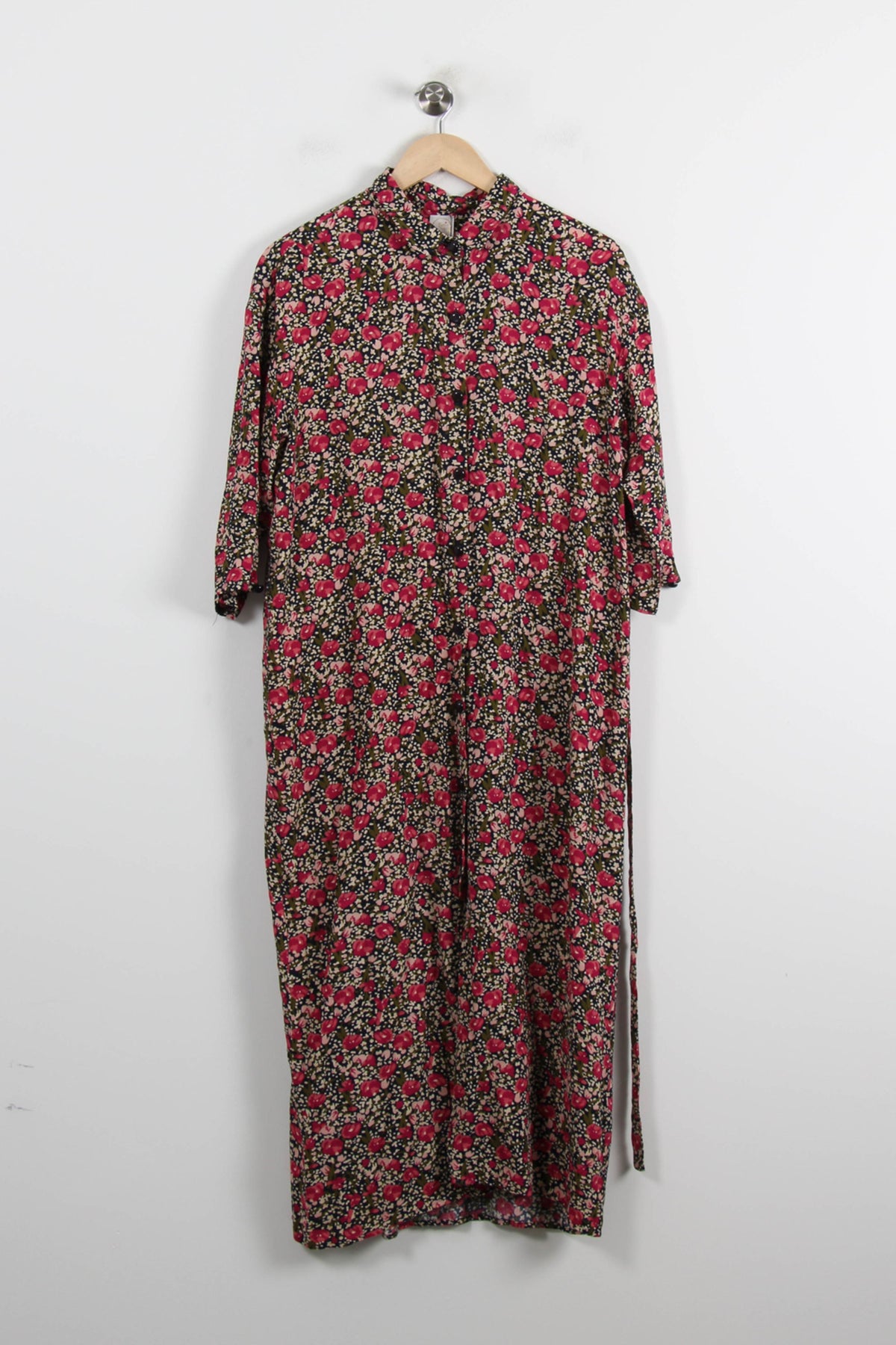 Robe longue Des Petits Hauts, taille S/36, au motif fleuri prédominant rouge et fond sombre. Confectionnée dans une matière fluide, elle se distingue par son imprimé floral délicat, une boutonnière sur le devant ainsi qu’une ceinture assortie, qui lui confèrent un charme féminin et raffiné. Idéale pour une promenade en ville ou un déjeuner printanier.