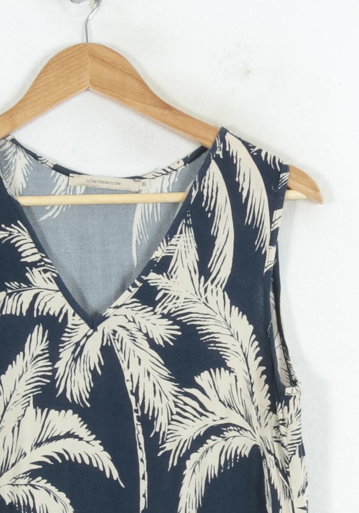 Robe longue sans manches La Fée Maraboutée bleu à motif palmiers, taille M/38, parfaite pour une silhouette estivale élégante. Confectionnée dans une matière légère, cette robe met en valeur un imprimé végétal audacieux, un col en V raffiné et une ceinture assortie qui souligne subtilement la taille, offrant confort et originalité. Idéale pour une journée en bord de mer, une promenade estivale ou un brunch en terrasse.