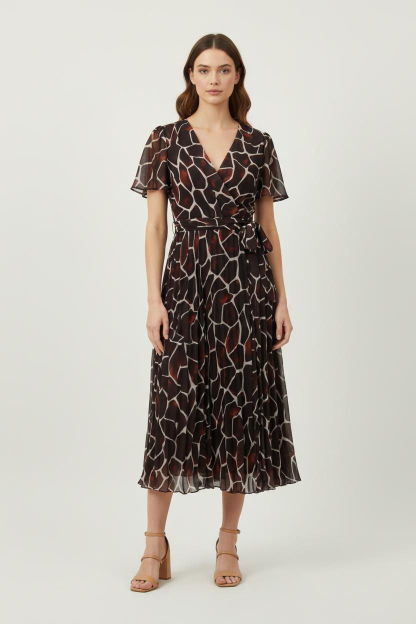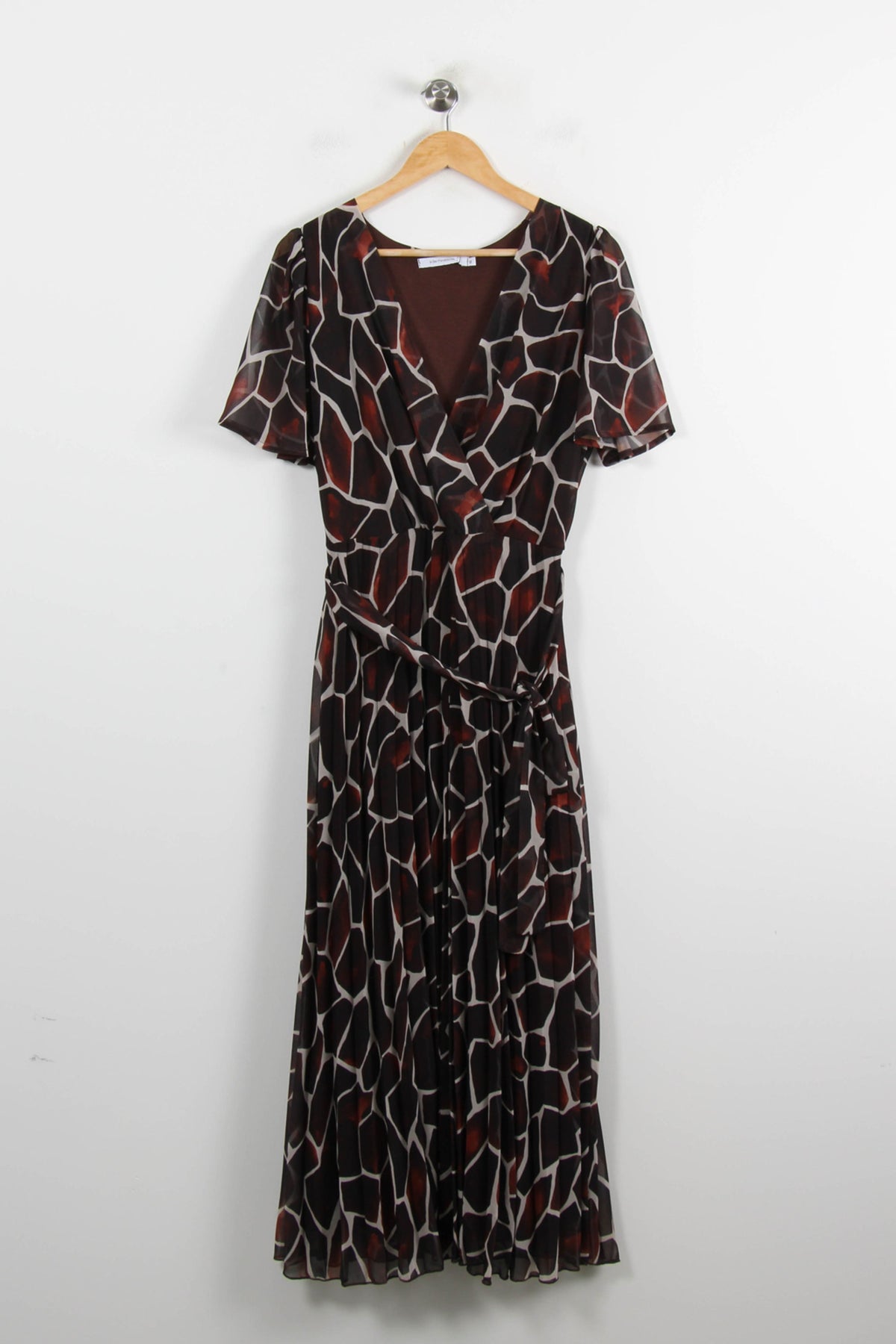 Robe longue portefeuille La Fée Maraboutée, taille XL/42, en coloris marron avec un imprimé graphique élégant. La matière légère et fluide, associée à sa coupe portefeuille et à ses manches courtes, confère à cette robe un tombé chic et un style unique, idéalement mis en valeur par son motif original. Parfaite pour une réception estivale ou un dîner élégant, cette pièce se distingue par son allure sophistiquée et moderne.