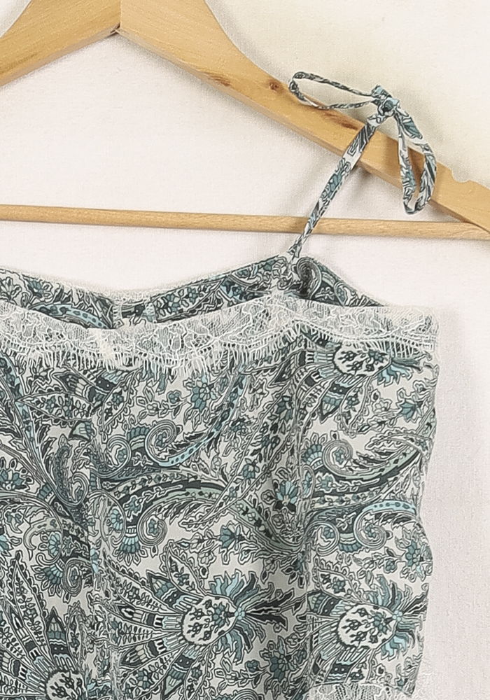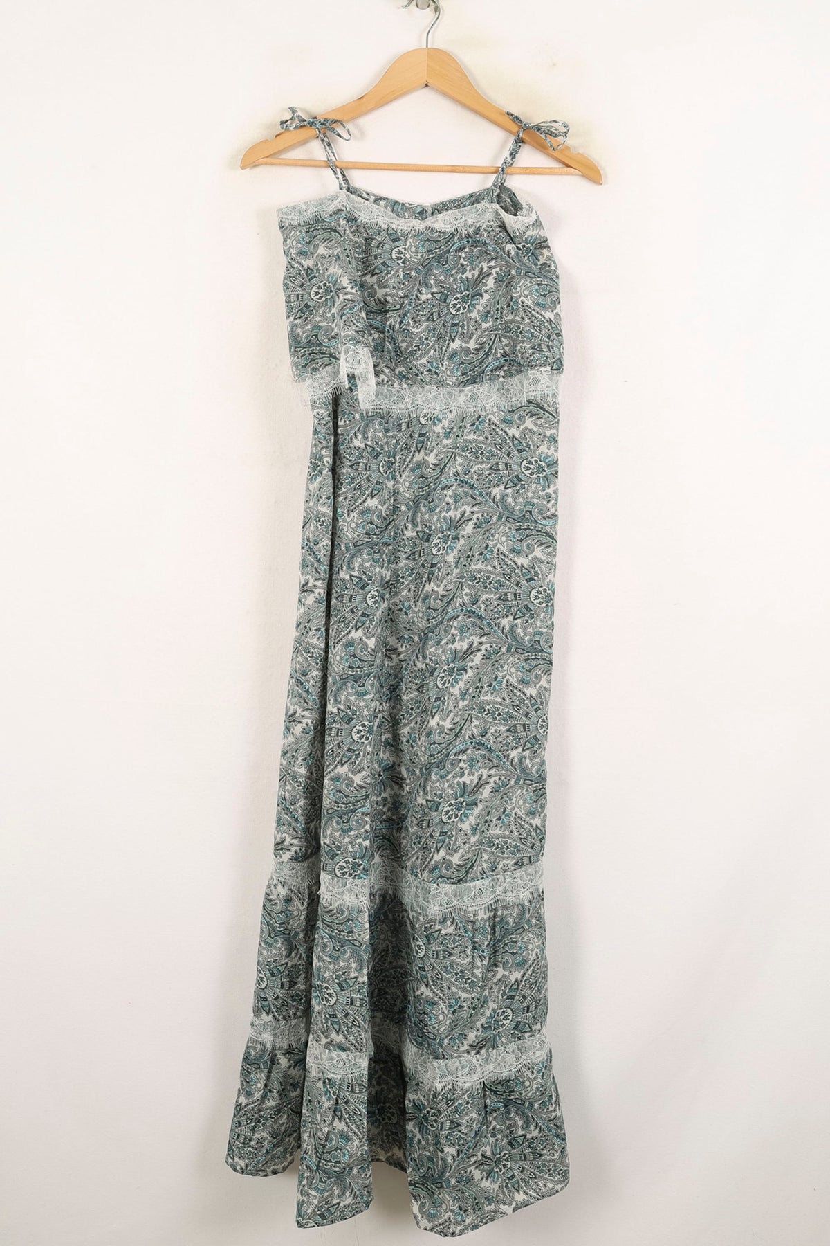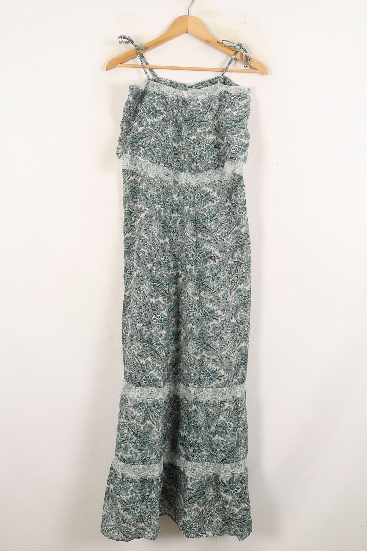 Robe longue multicolore Bérénice taille S/36, présentant un motif floral délicat et des bretelles fines à nouer sur les épaules. Cette pièce se distingue par sa matière fluide et légère, rehaussée de bandes en dentelle blanche qui ajoutent une touche raffinée et féminine à l’ensemble. Idéale pour une journée estivale ou un événement en extérieur, cette robe allie élégance et décontraction naturelle.