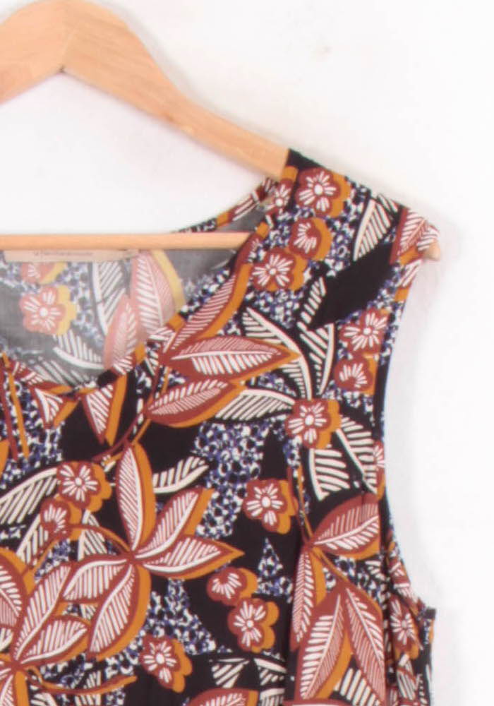 Robe longue multicolore La Fée Maraboutée, modèle sans manches, taille XL/42. Confectionnée dans une matière fluide, cette robe se distingue par ses motifs floraux aux nuances chaleureuses et son col en V original, apportant singularité et raffinement à l’ensemble. Idéale pour une promenade estivale ou un déjeuner en terrasse.
