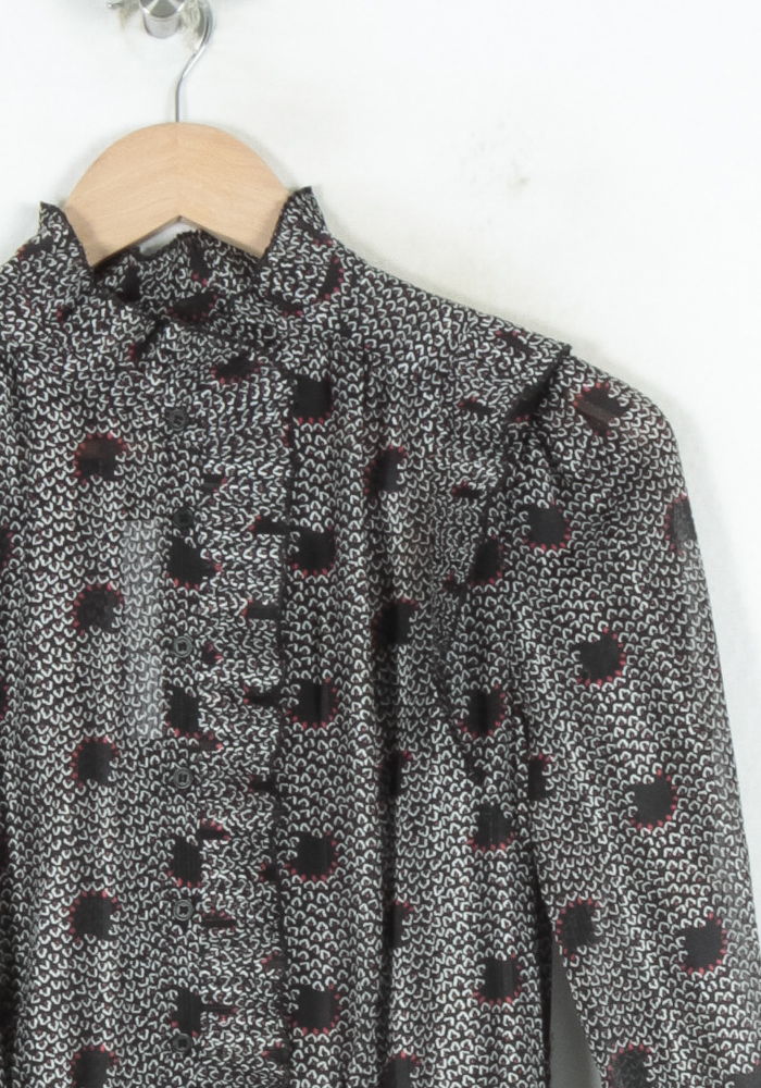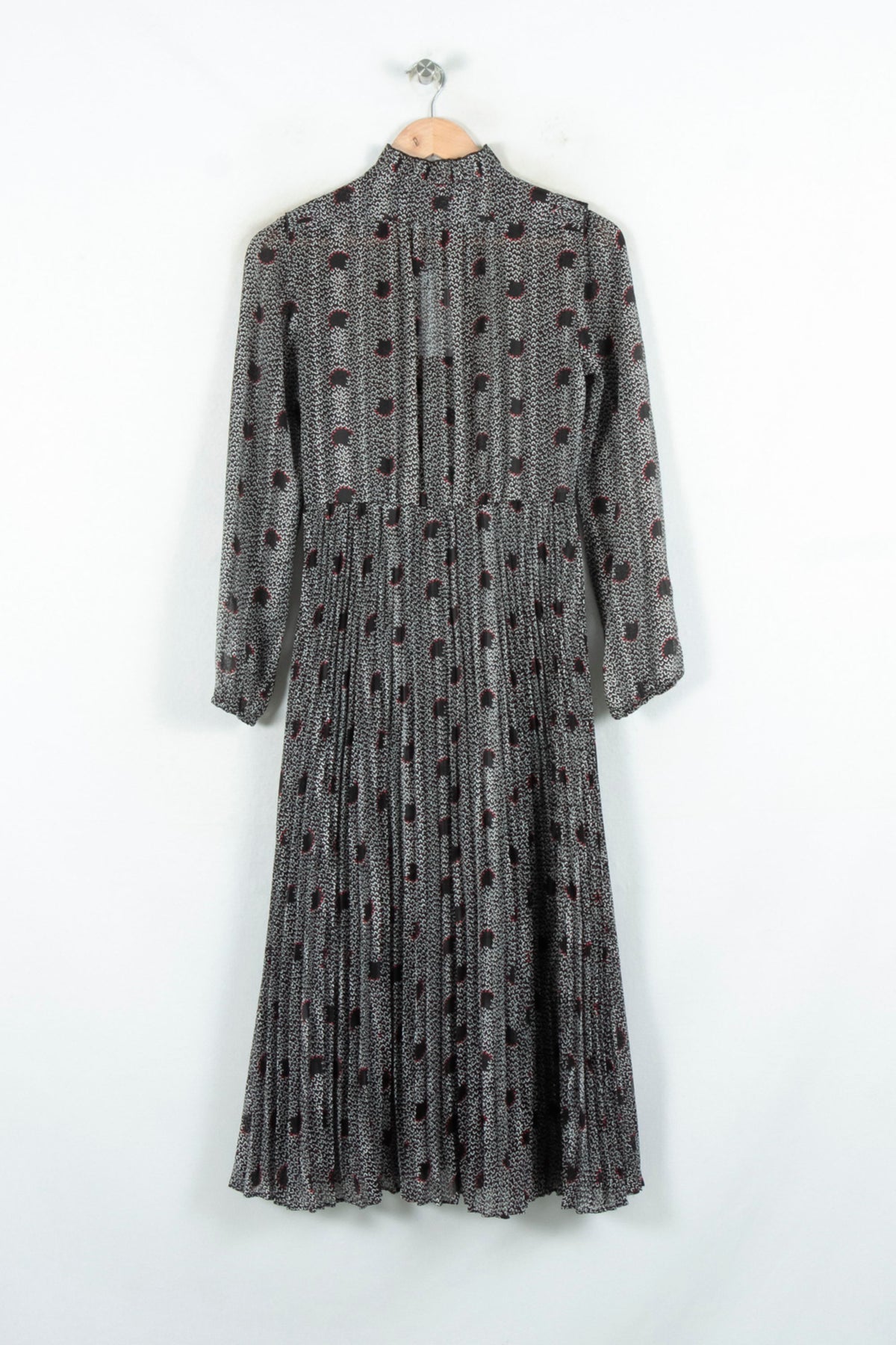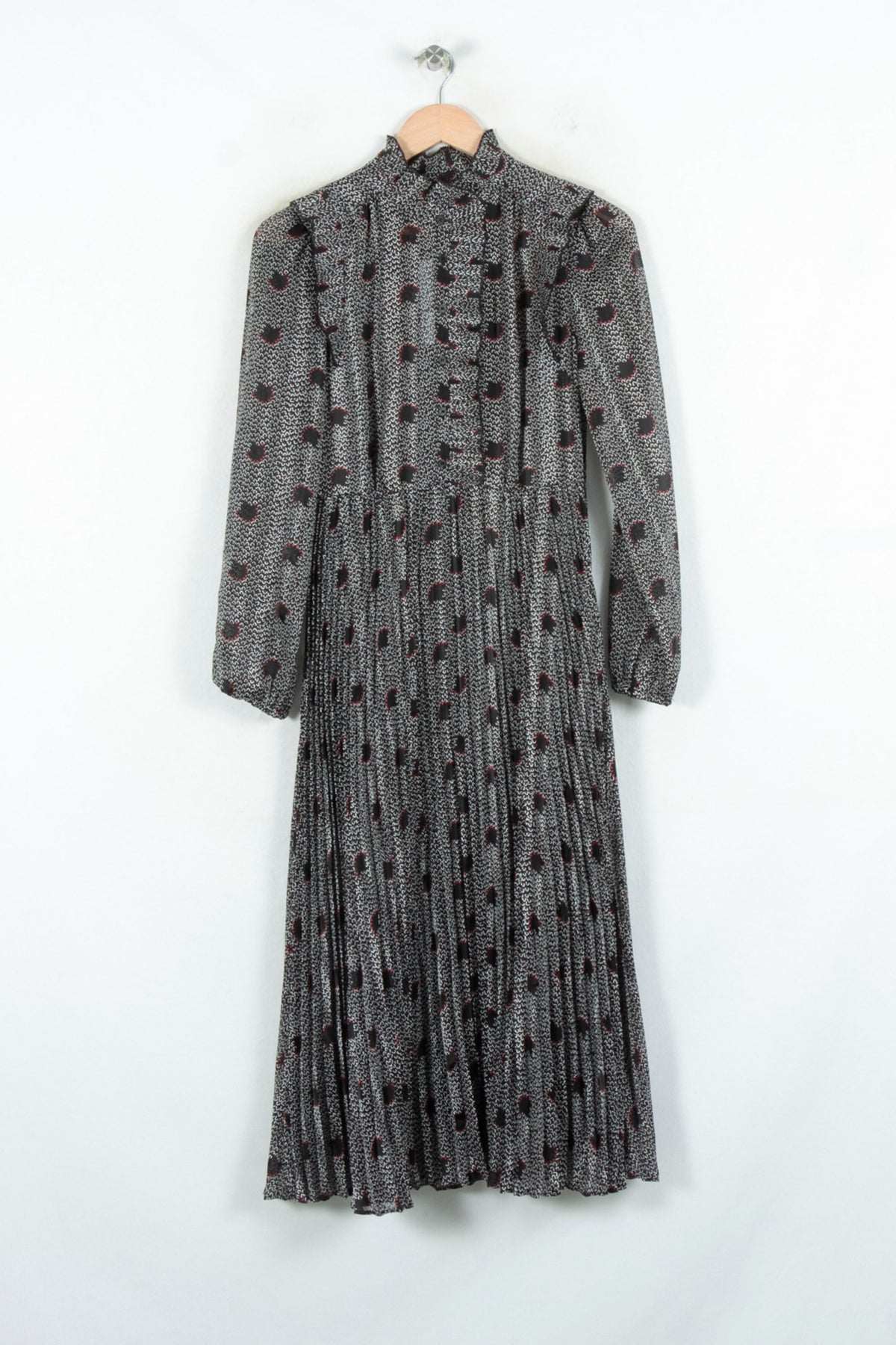 Robe longue multicolore ba&sh, taille XS/34, dotée de manches longues, d’un col montant et d’une fermeture boutonnée sur le devant. Confectionnée dans un tissu léger à motif graphique agrémenté de touches florales, elle se distingue par son plissé délicat et ses volants subtils sur les épaules, ajoutant une touche de raffinement à la silhouette. Idéale pour une réception ou une soirée élégante, cette robe assure allure et distinction en toute circonstance.