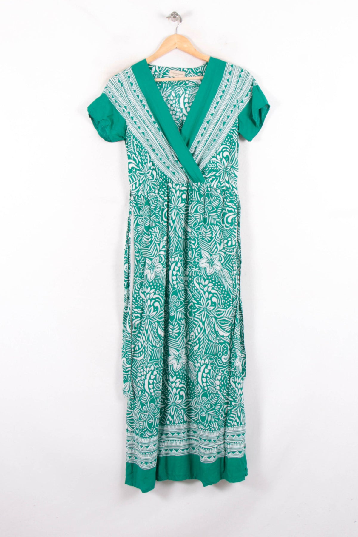Robe longue verte à motifs floraux La Fée Maraboutée, taille M/38. Confectionnée dans une matière fluide, cette robe présente un élégant col cache-cœur, de courtes manches et un imprimé floral blanc délicat rehaussé de fines bandes graphiques sur le buste et le bas, soulignant un style unique et raffiné. Idéale pour une garden-party estivale ou une sortie décontractée chic en journée.