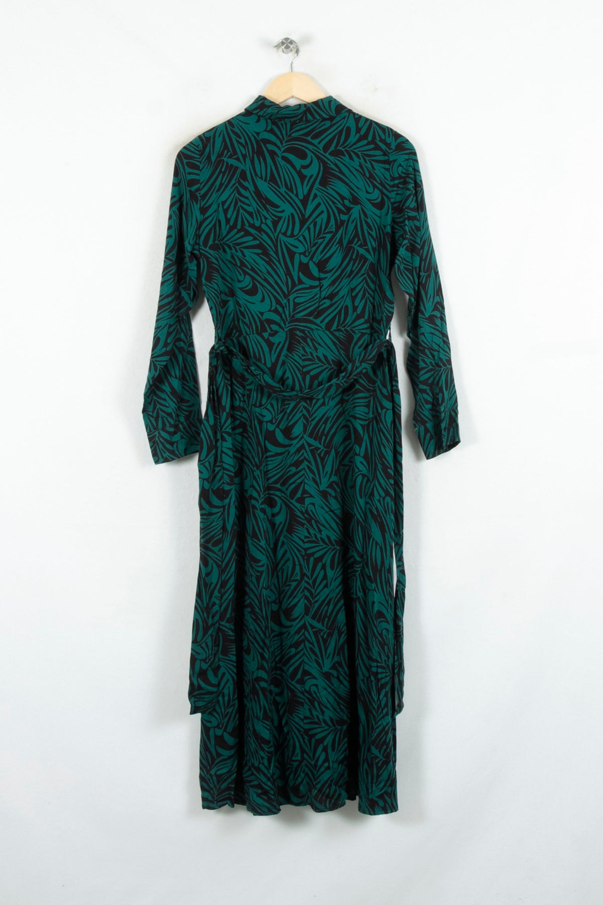 Robe longue à motifs feuillage vert et noir de la marque La Fée Maraboutée, taille S/36. Confectionnée dans une matière fluide et légère, cette robe se distingue par son imprimé graphique végétal et sa coupe chemisier boutonnée, qui lui confère une allure élégante et intemporelle. Idéale pour une journée au bureau ou une sortie culturelle en ville, elle s'adapte parfaitement à un style chic et raffiné.