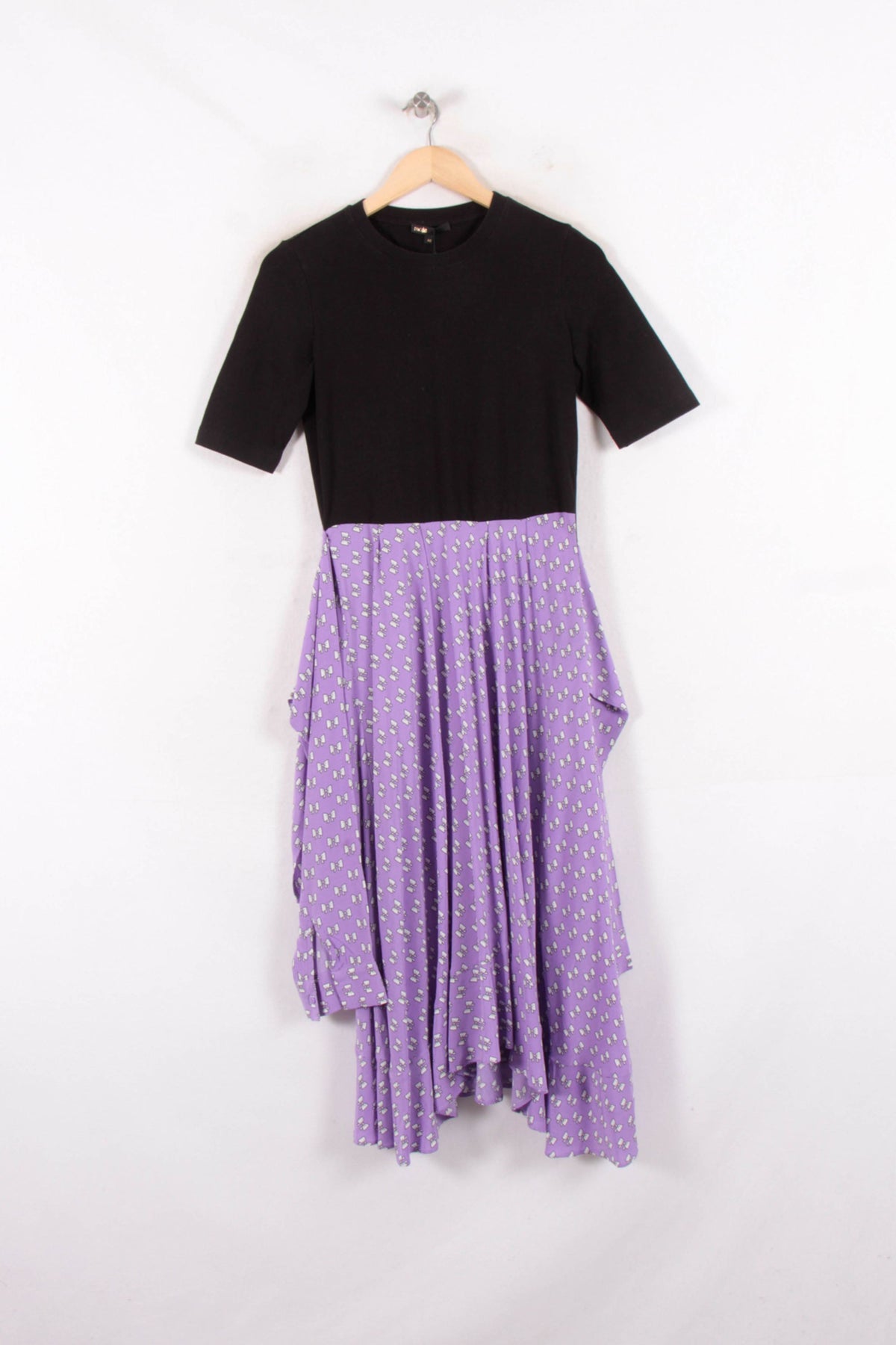 Robe multicolore Maje, taille L/40 : modèle bicolore à manches courtes, haut noir uni et bas fluide parme à motifs imprimés. Le contraste marqué entre le haut structuré et la jupe fluide à l’imprimé délicat confère à cette pièce une allure contemporaine et féminine, tandis que la matière souple de la jupe assure un tombé élégant et un confort remarquable. Idéale pour une journée en ville ou une occasion semi-formelle nécessitant une touche d’originalité.