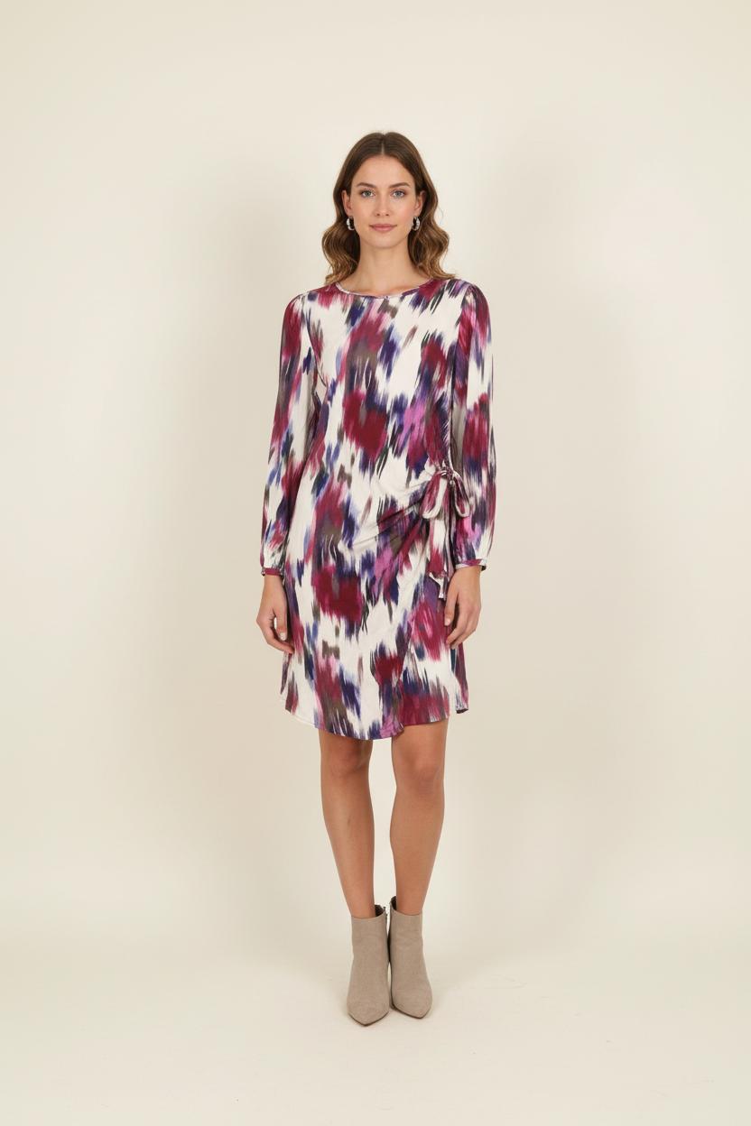 Robe multicolore La Fée Maraboutée, taille XL/42, à imprimé abstrait et manches longues. Cette pièce remarquable présente une matière fluide et légère, sublimée par un imprimé aux nuances de violet, fuchsia et blanc, et se distingue par sa coupe portefeuille avec nœud sur le côté apportant une touche d’originalité. Idéale pour une occasion spéciale ou une sortie élégante, cette robe saura mettre en valeur votre silhouette tout en offrant un confort optimal.