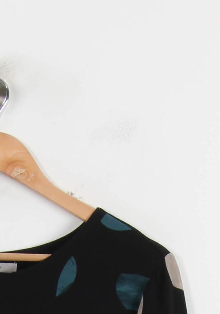 Robe multicolore La Fée Maraboutée, taille XL/42, alliant élégance et modernité grâce à son imprimé graphique. Confectionnée dans une matière fluide, cette robe arbore de larges motifs circulaires bleu canard et beige sur fond noir, ainsi que des manches longues légèrement resserrées aux poignets pour une touche sophistiquée et unique. Idéale pour un déjeuner chic ou une sortie entre amis, elle offre confort et style en toutes circonstances.