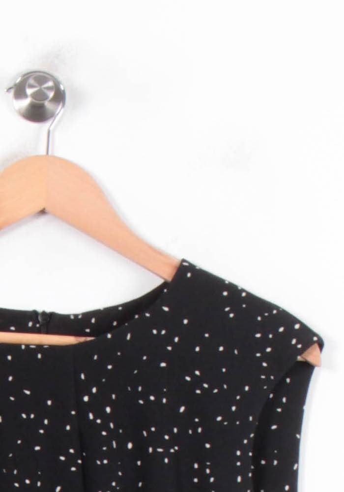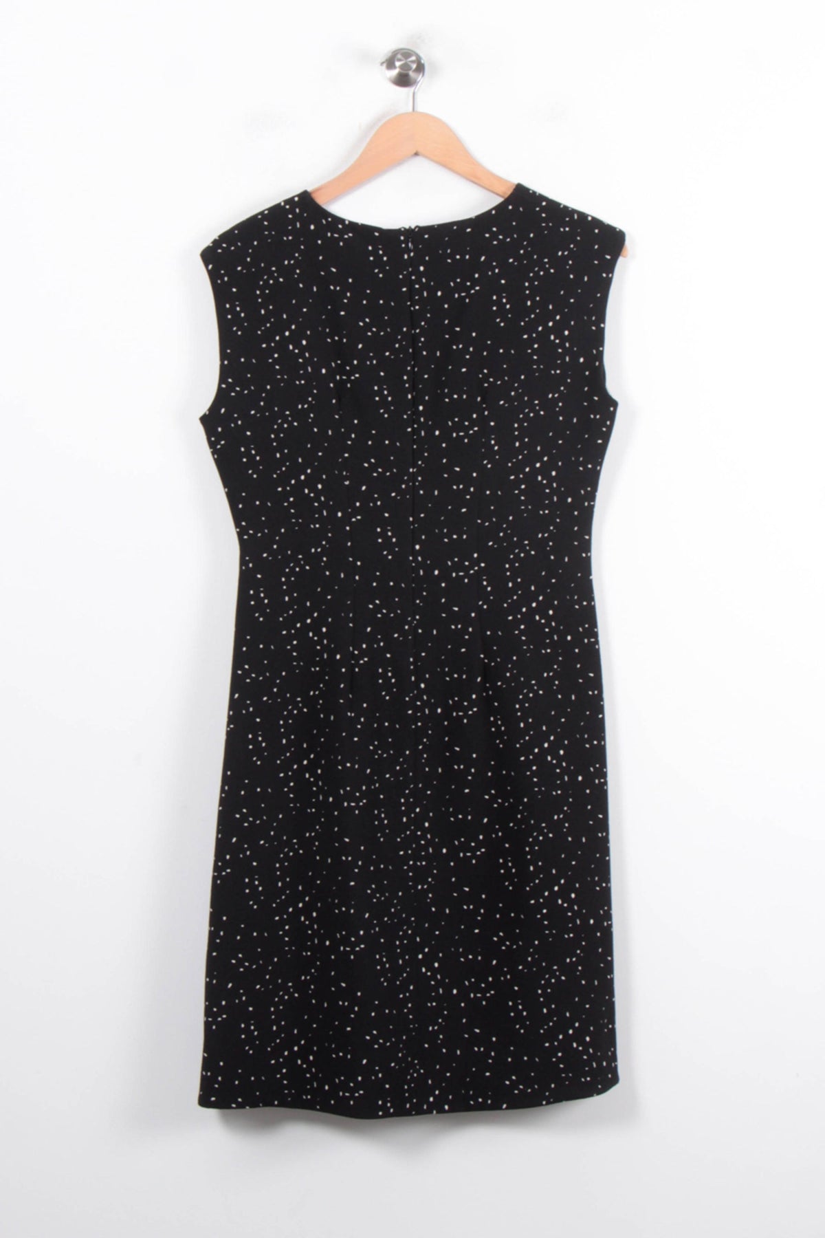 Robe noire La Fée Maraboutée taille L/40, à imprimé discret de petits pois blancs pour une allure moderne et féminine. Confectionnée dans une matière fluide, cette robe sans manches présente des plis plats à l'avant et un motif all-over qui lui confèrent une élégance intemporelle et une note graphique. Idéale pour sublimer un rendez-vous professionnel ou une sortie entre amis.