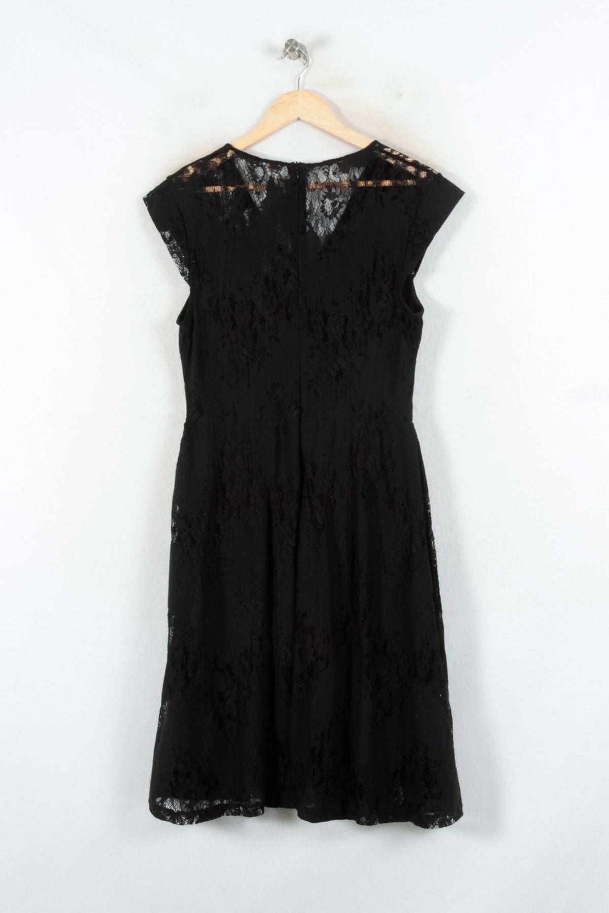 Robe noire La Fée Maraboutée, taille L/40, élégante et intemporelle. Confectionnée dans une matière délicate rehaussée de dentelle, elle se distingue par son encolure en V et ses empiècements transparents sur les épaules, apportant une touche raffinée et féminine. Idéale pour une soirée habillée ou un événement spécial, elle incarne le chic sans effort.