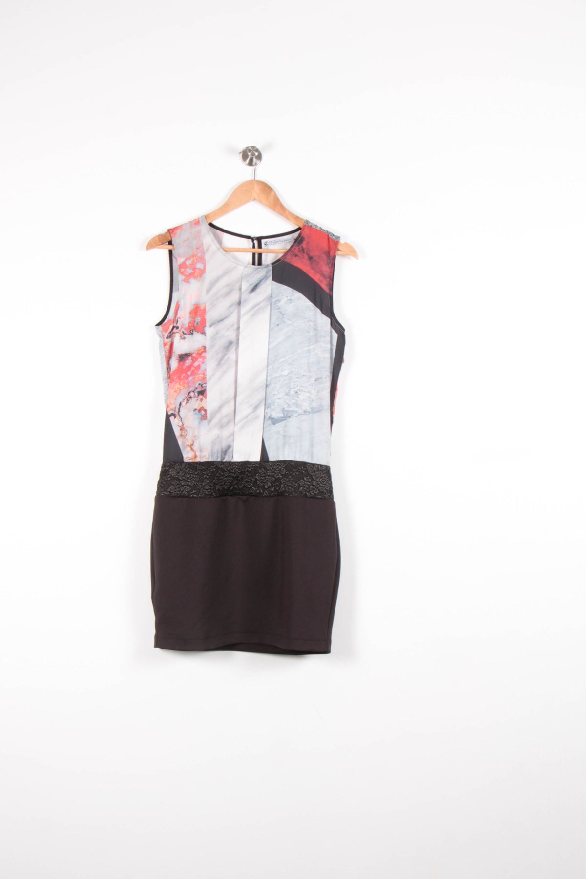 Robe ajustée sans manches La Fée Maraboutée, taille S/36, au design multicolore contemporain. Le haut présente un jeu de motifs colorés abstraits et une bande texturée noire à la taille, contrastant élégamment avec la jupe noire unie, apportant sophistication et originalité à la pièce. Idéale pour une soirée ou un événement artistique, cette robe saura attirer tous les regards.
