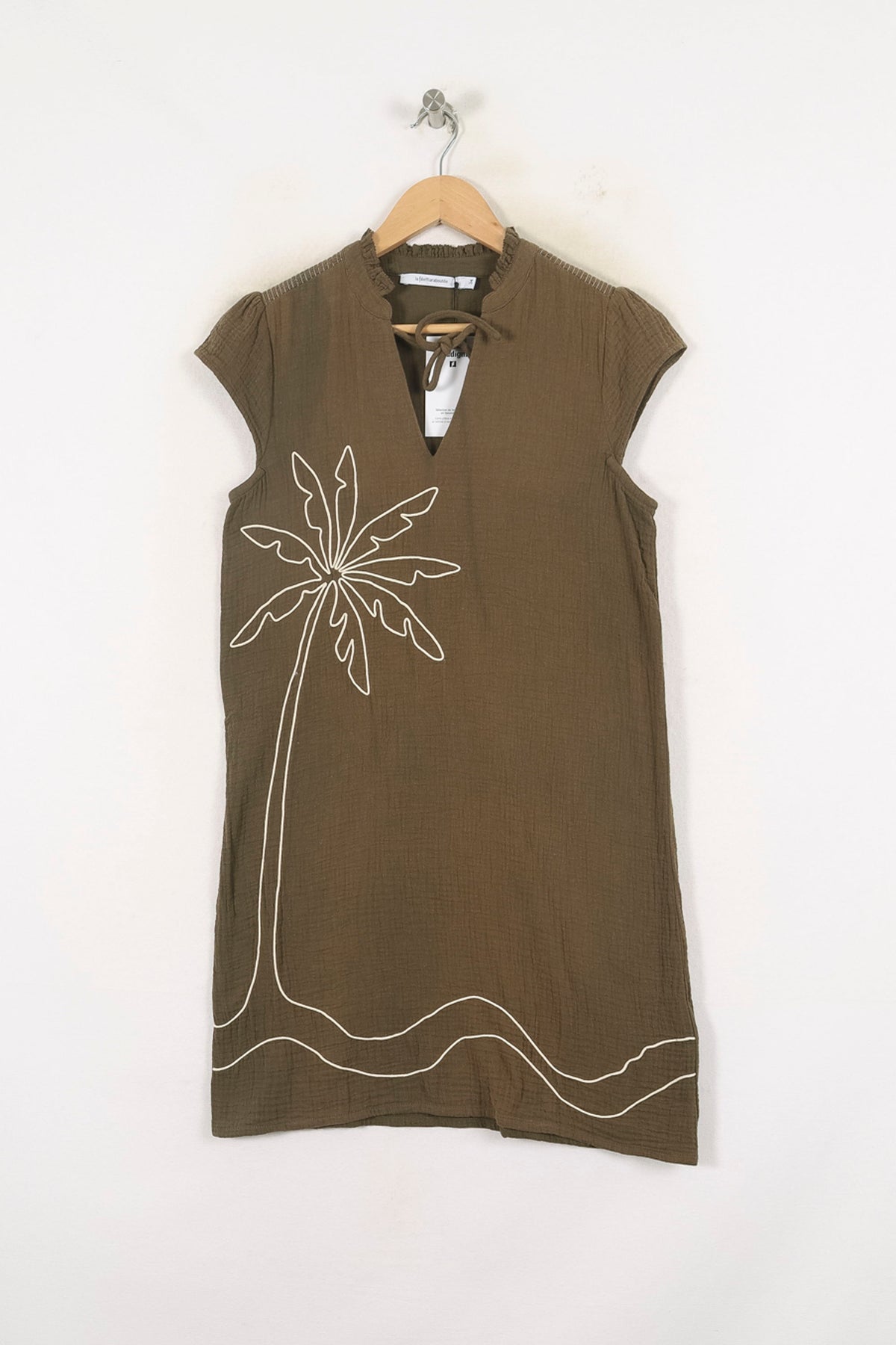 Robe courte verte La Fée Maraboutée, taille XS/34, à manches courtes et col rond à liens, idéale pour une silhouette élégante et décontractée. Confectionnée dans une matière légère à effet gaufré, cette robe se distingue par son motif original de palmier brodé en blanc sur le devant, apportant une touche d’exotisme et d’originalité à la pièce. Parfaite pour une escapade estivale ou une soirée décontractée en bord de mer.