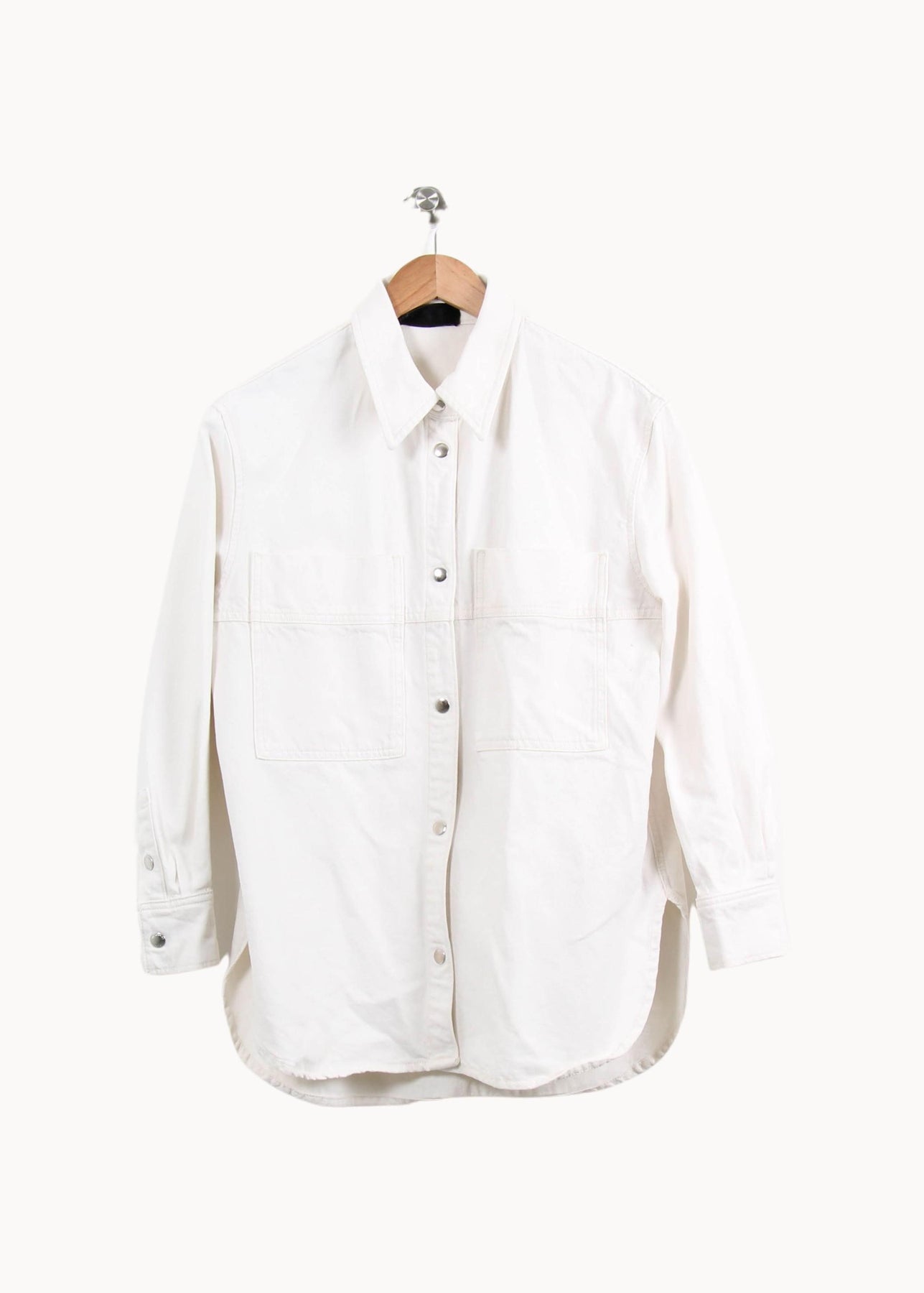 Veste blanche The Kooples en taille S/36, coupe droite et boutonnée sur le devant, idéale pour une allure épurée et contemporaine. Confectionnée dans une matière naturellement structurée, cette veste se distingue par ses surpiqûres apparentes et ses grandes poches plaquées qui ajoutent une touche graphique raffinée. À porter lors d’un déjeuner en ville ou pour dynamiser un look casual-chic en journée.