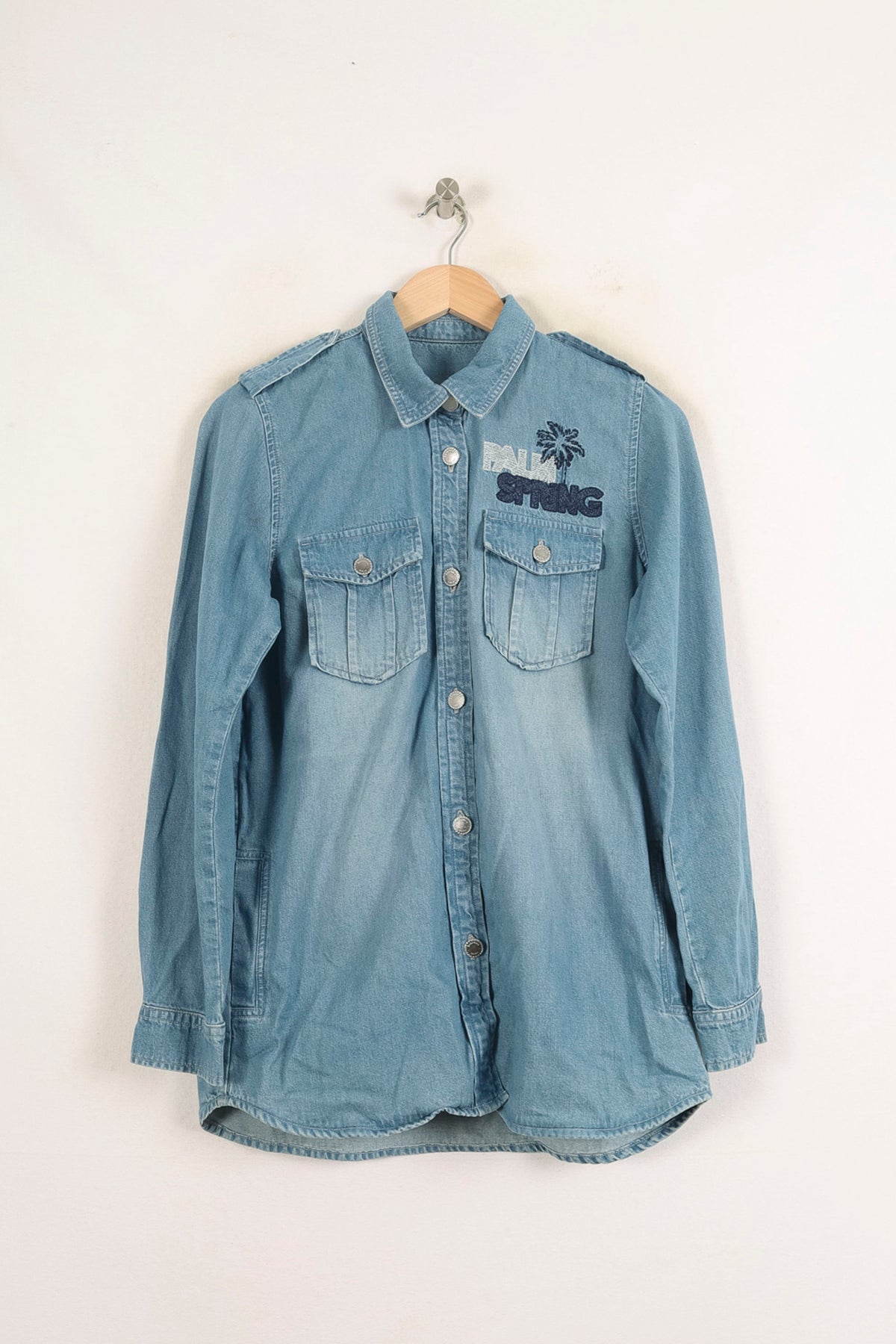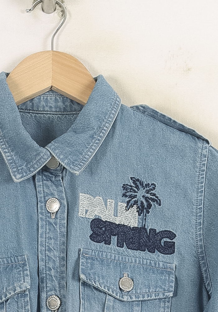 Veste en jean bleu Bérénice, taille S/36, arborant un style casual-chic avec broderie "Palm Springs" sur la poitrine. Confectionnée dans un denim souple, elle se démarque par ses deux poches à rabat boutonnées et ses épaulettes discrètes, apportant une touche d’originalité et de modernité à la silhouette. Parfaite pour une journée décontractée en ville ou une sortie entre amis lors des beaux jours.