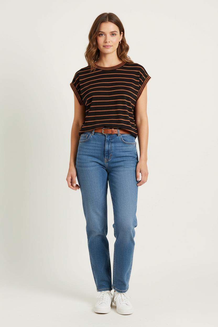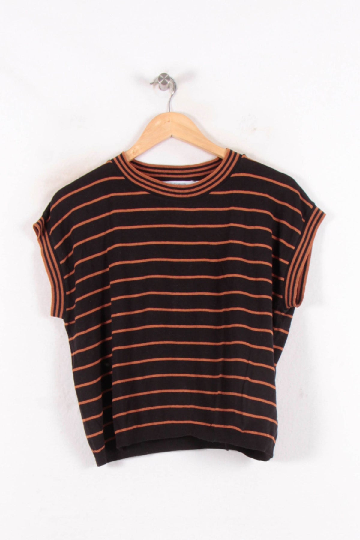 Pull rayé La Fée Maraboutée, taille M/38, multicolore – un essentiel moderne de la marque. Ce pull à manches courtes présente un motif de fines rayures orange sur fond noir, avec des finitions côtelées au col et aux manches, apportant une touche graphique et contemporaine à la silhouette. Idéal pour une journée décontractée en ville, associé à un jean ou une jupe pour un look casual chic.