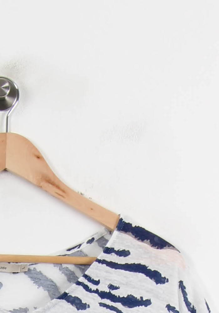 Top multicolore à imprimé graphique, taille L/40, La Fée Maraboutée. Confectionné dans une matière fluide, ce haut se distingue par son imprimé zébré bleu marine et blanc, ses manches courtes et sa coupe légèrement ample pour un tombé moderne. Ce top est idéal pour une journée décontractée, associé à un jean ou une jupe unie.