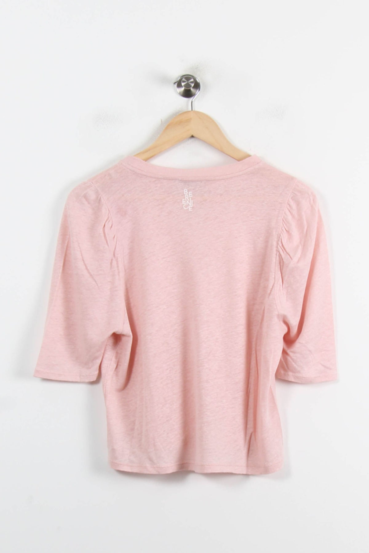 Top rose à manches mi-longues Bérénice, taille S/36, idéal pour une silhouette féminine et élégante. Confectionné dans une matière légère et subtilement texturée, ce top se distingue par ses épaules légèrement froncées qui apportent une note délicate et raffinée. Parfait pour une journée au bureau ou un déjeuner en terrasse, alliant confort et style au quotidien.
