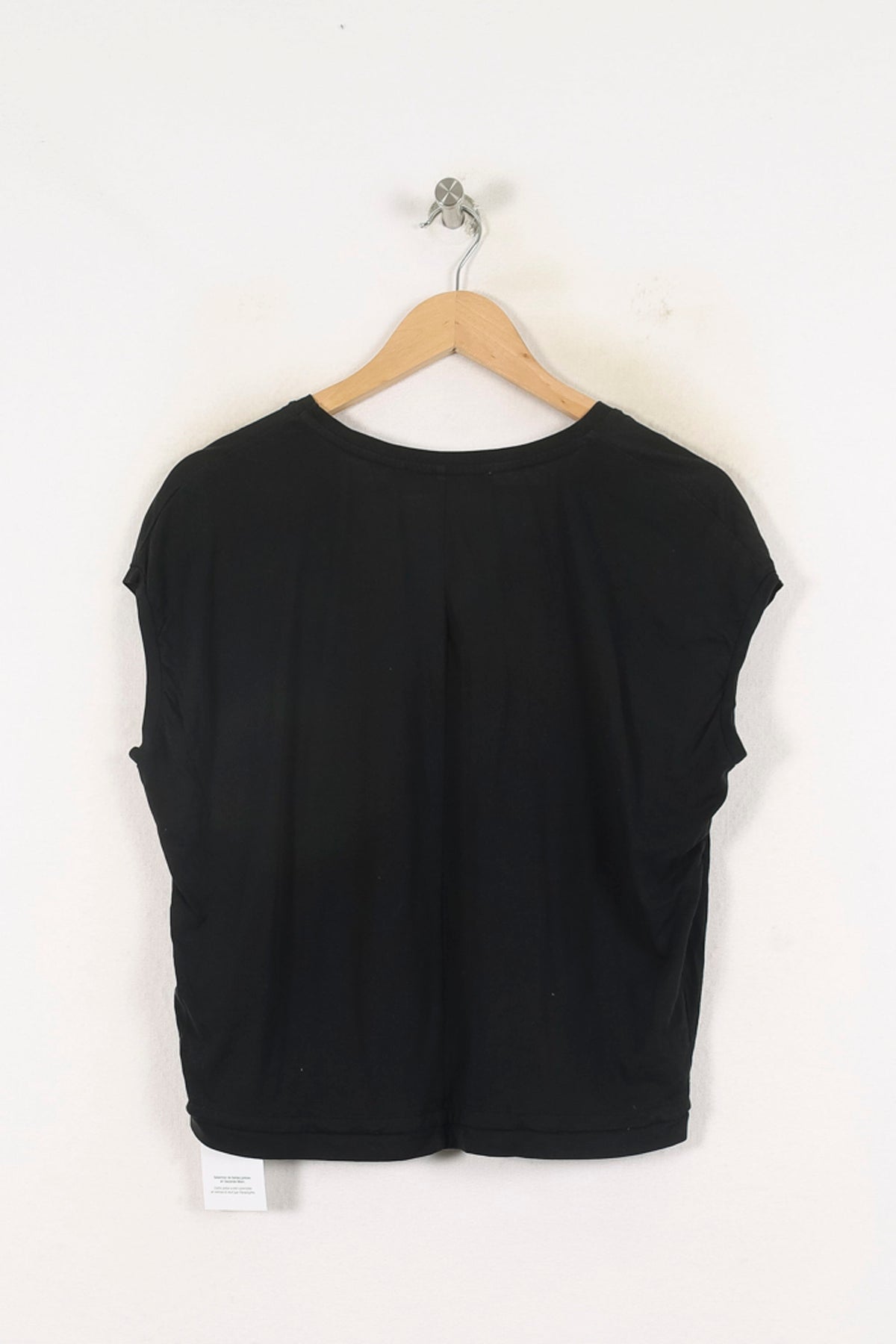 Top noir col V La Fée Maraboutée, taille S/36, élégant et sobre, parfait pour compléter votre garde-robe. Confectionné dans une matière fluide et légère, il offre une coupe droite avec des manches très courtes pour un tombé naturel et confortable, accentuant son côté intemporel. Ce top se porte aussi bien lors d'une journée de travail avec un pantalon tailoring, qu’en soirée pour une allure chic et décontractée.