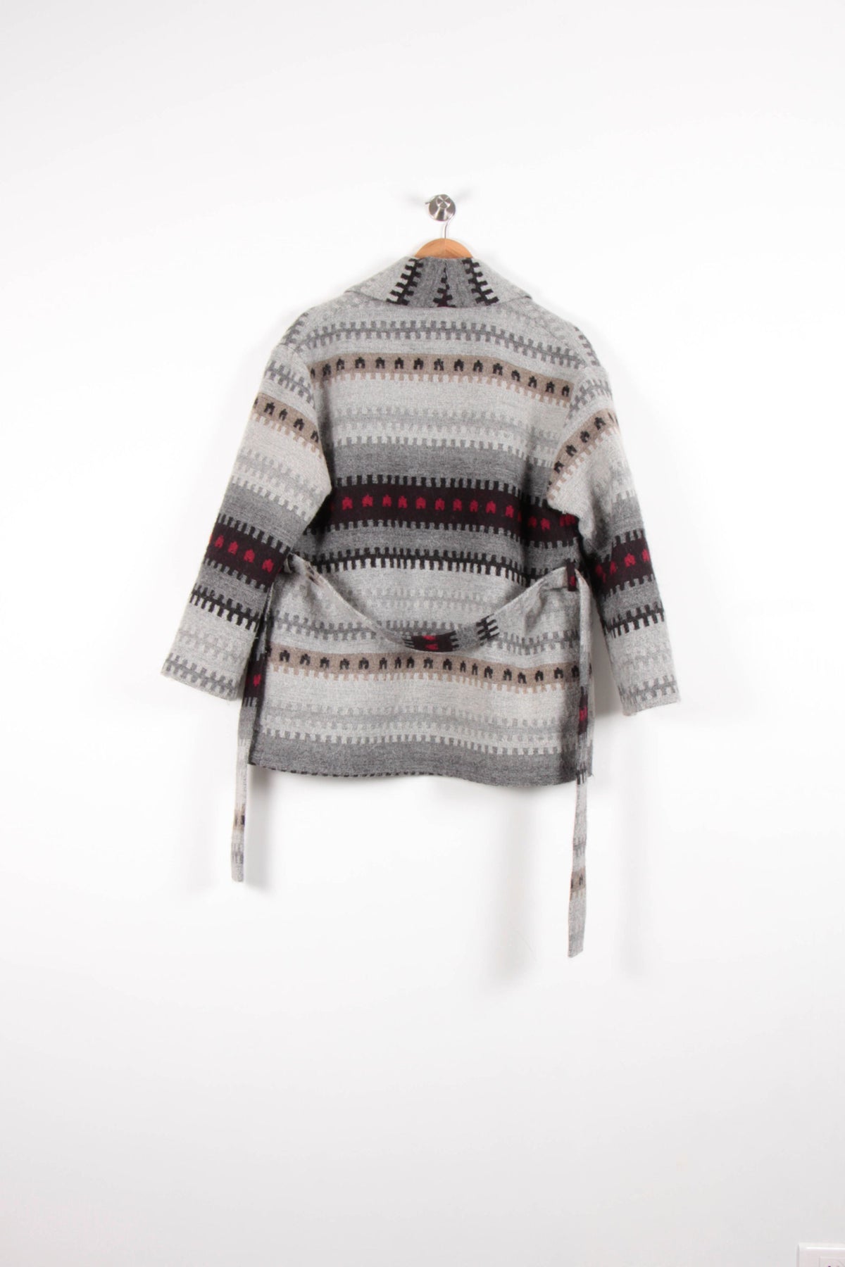 Manteau The Kooples taille M/38, gris, orné d’un motif géométrique bicolore et multicolore pour une allure contemporaine. Sa matière semble être un tissu épais et texturé, agrémenté d’une doublure noire et d’une ceinture assortie, apportant structure et originalité au vêtement. Idéal pour une sortie citadine ou pour rehausser une tenue décontractée lors d’un rendez-vous entre amis.