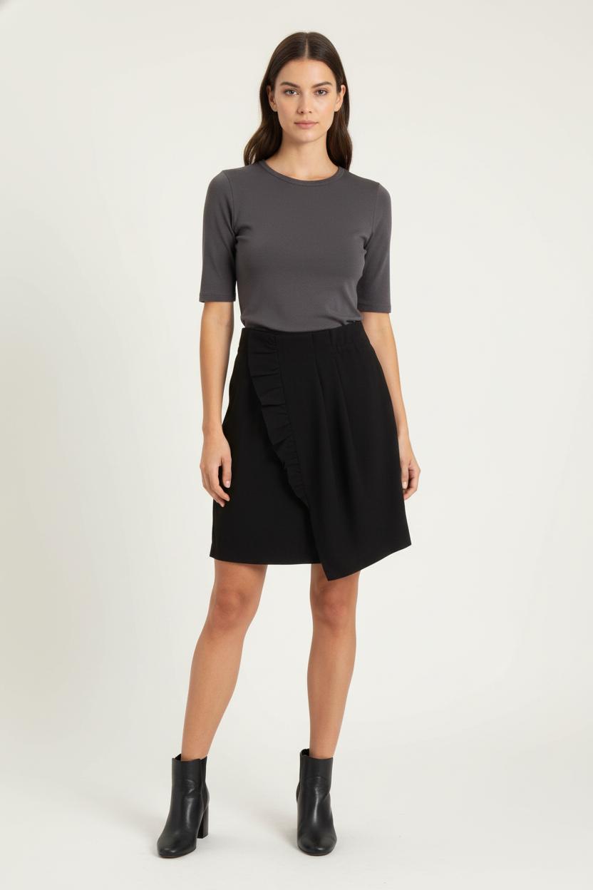 Jupe noire Bérénice en taille M/38, élégante et intemporelle, idéale pour compléter toute garde-robe raffinée. Confectionnée dans une matière fluide, cette jupe présente un détail original de volant asymétrique sur le devant, qui lui confère une touche de modernité et de mouvement subtil. Parfaite pour un rendez-vous professionnel ou une sortie chic entre amis.