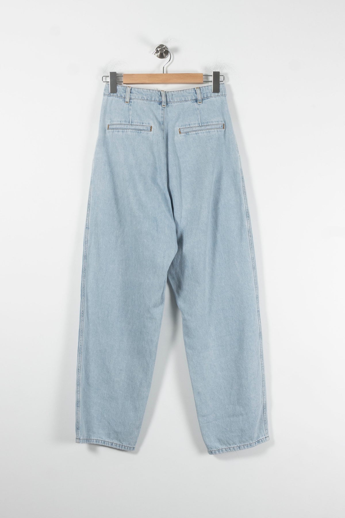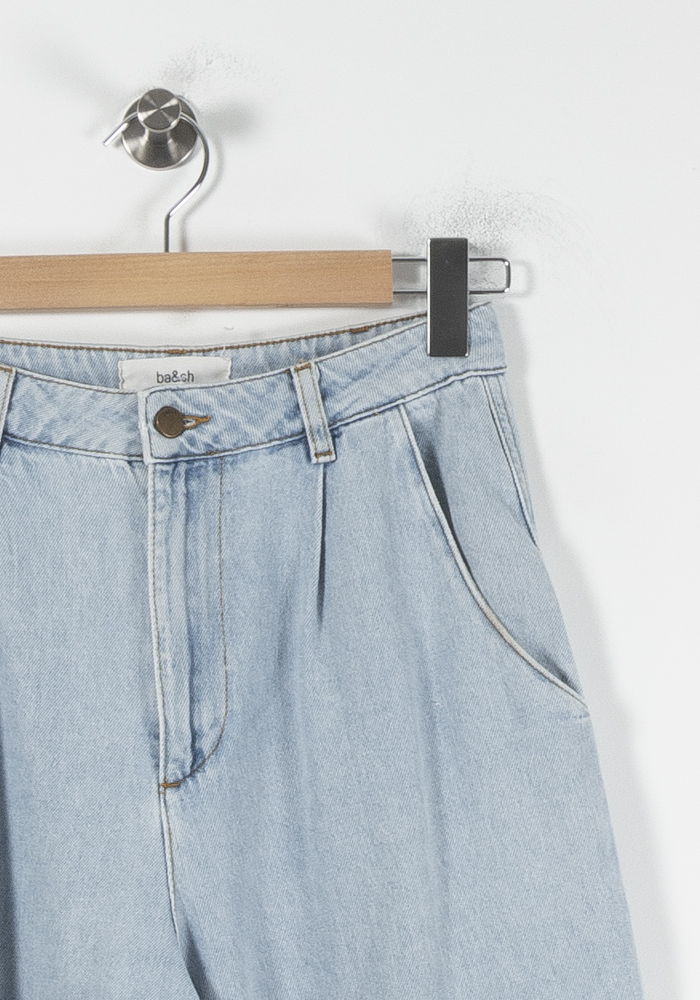 Pantalon en jean bleu clair ba&sh, taille XS/34, alliant élégance décontractée et coupe moderne. Confectionné en tissu principal 100% coton avec une doublure composée de 60% coton et 40% polyester, ce pantalon se distingue par sa texture souple et ses plis à la taille qui apportent volume et originalité. Idéal pour une journée citadine ou un brunch entre amis, il accompagne parfaitement une tenue casual chic.