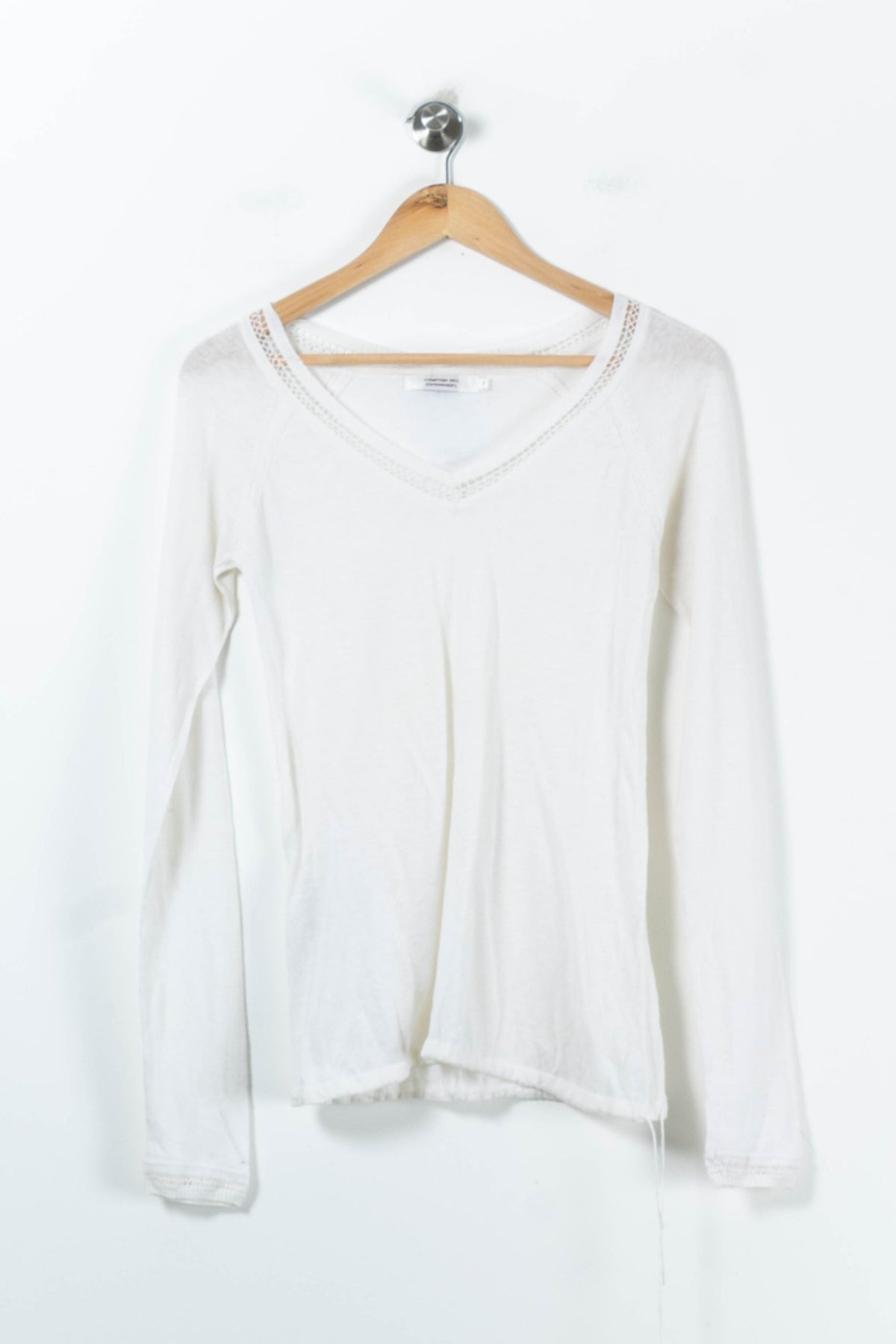 Pull blanc Comptoir des Cotonniers taille S/36 – Élégant et intemporel, ce haut à manches longues séduit par sa simplicité raffinée. Confectionné en lin (55%) et coton (45%), il offre une agréable douceur et une légèreté naturelle, rehaussées par de délicats détails ajourés sur le décolleté en V pour une touche féminine. Idéal pour composer une tenue chic et décontractée lors d’un déjeuner en ville ou d’une promenade printanière.