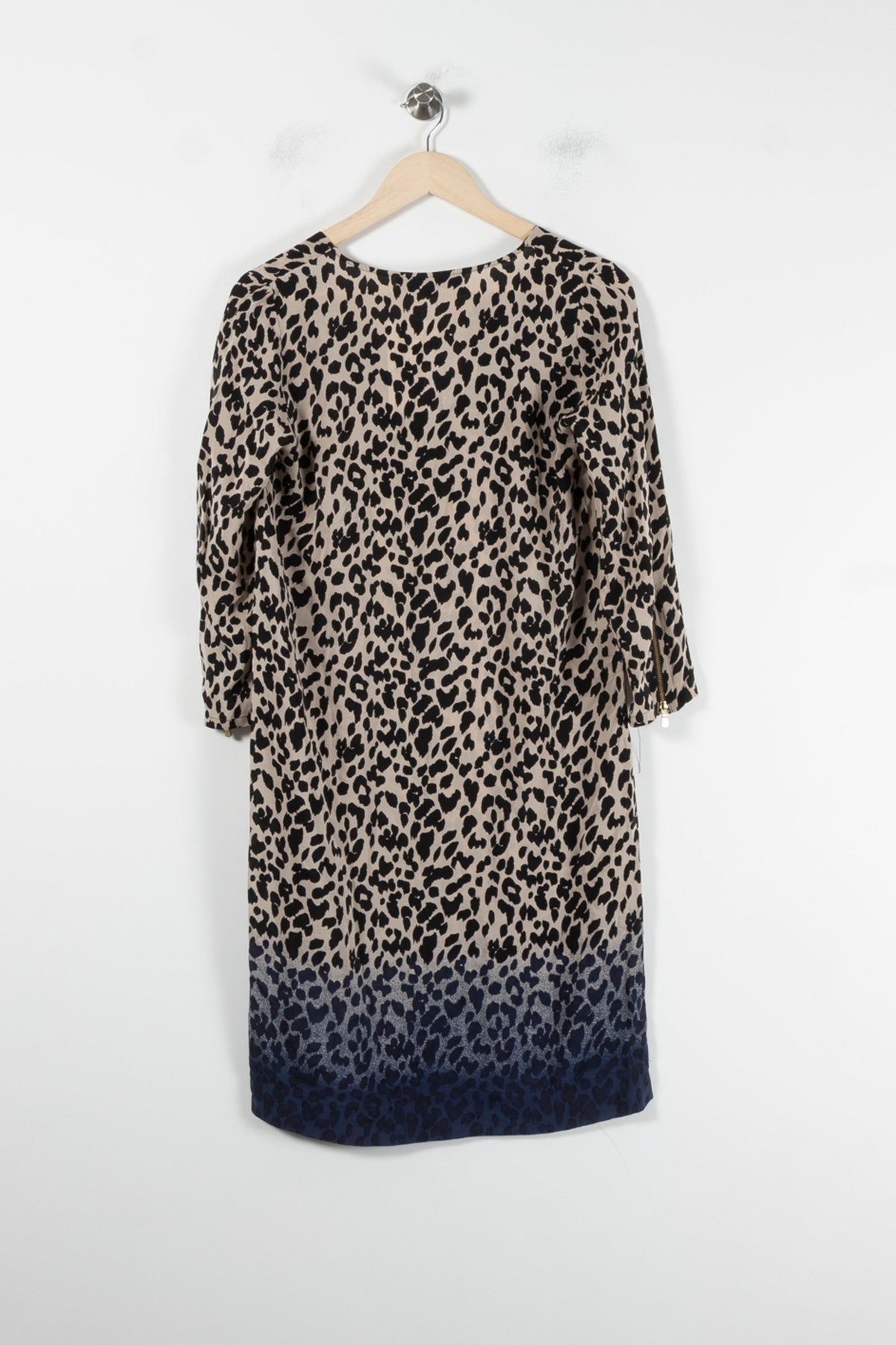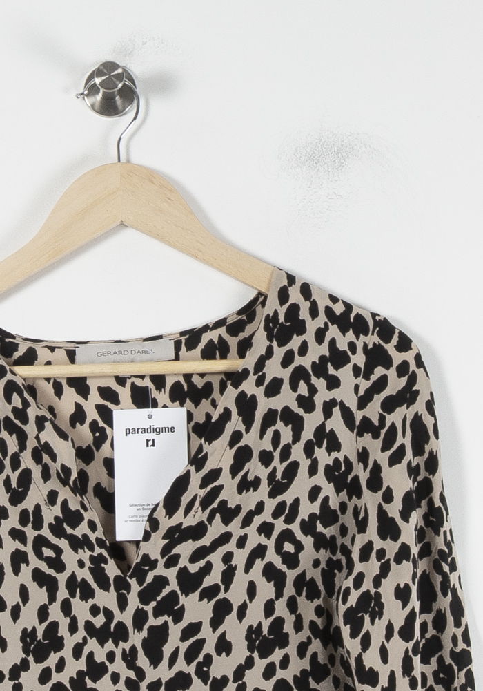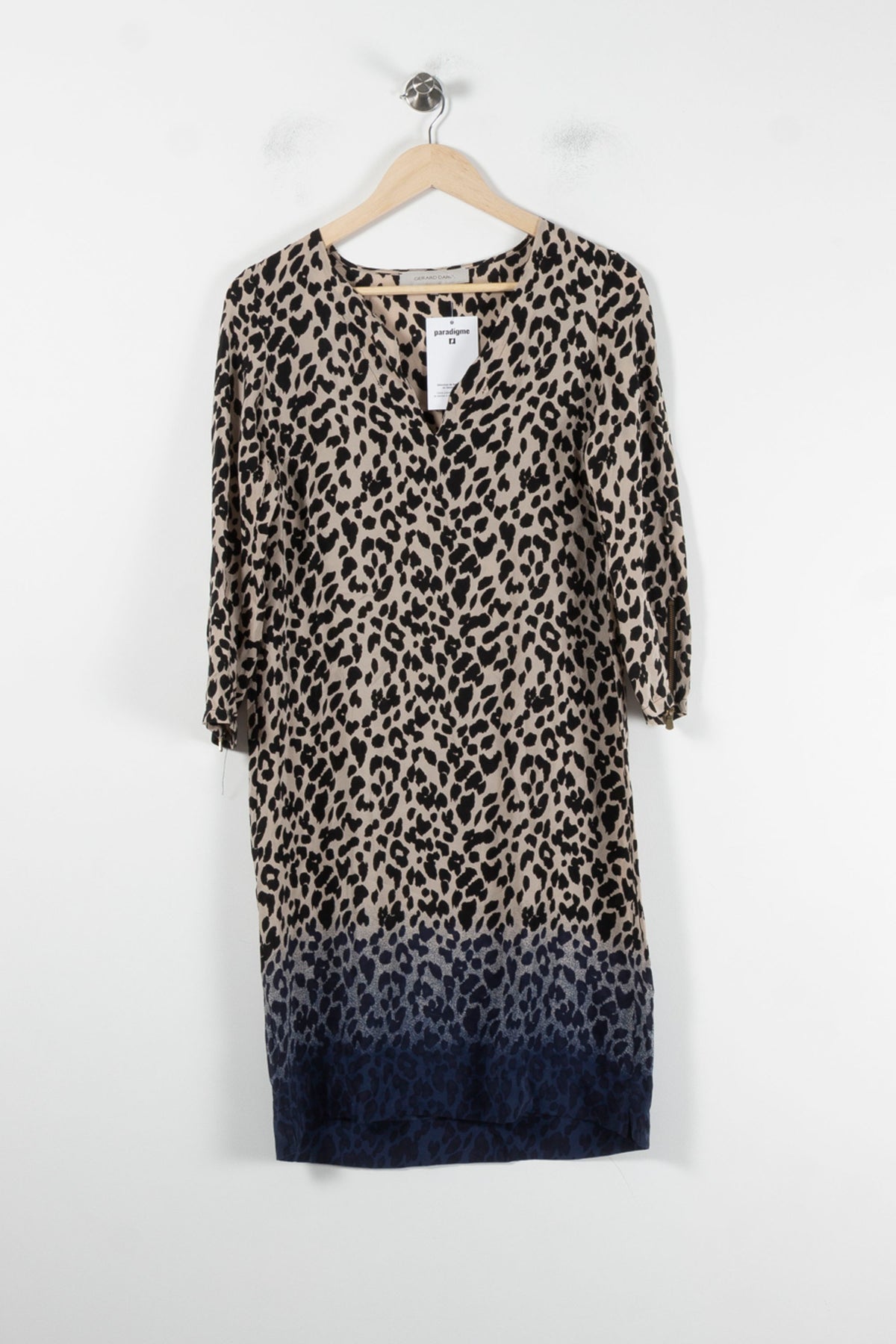 Robe imprimé léopard multicolore Gerard Darel, taille S/36. Confectionnée en 100% soie, cette robe se distingue par son toucher délicat et son motif animalier sophistiqué, sublimé par un dégradé foncé au bas de la pièce et des manches trois-quarts élégantes. Idéale pour une soirée chic ou un événement professionnel où raffinement et modernité sont de mise.