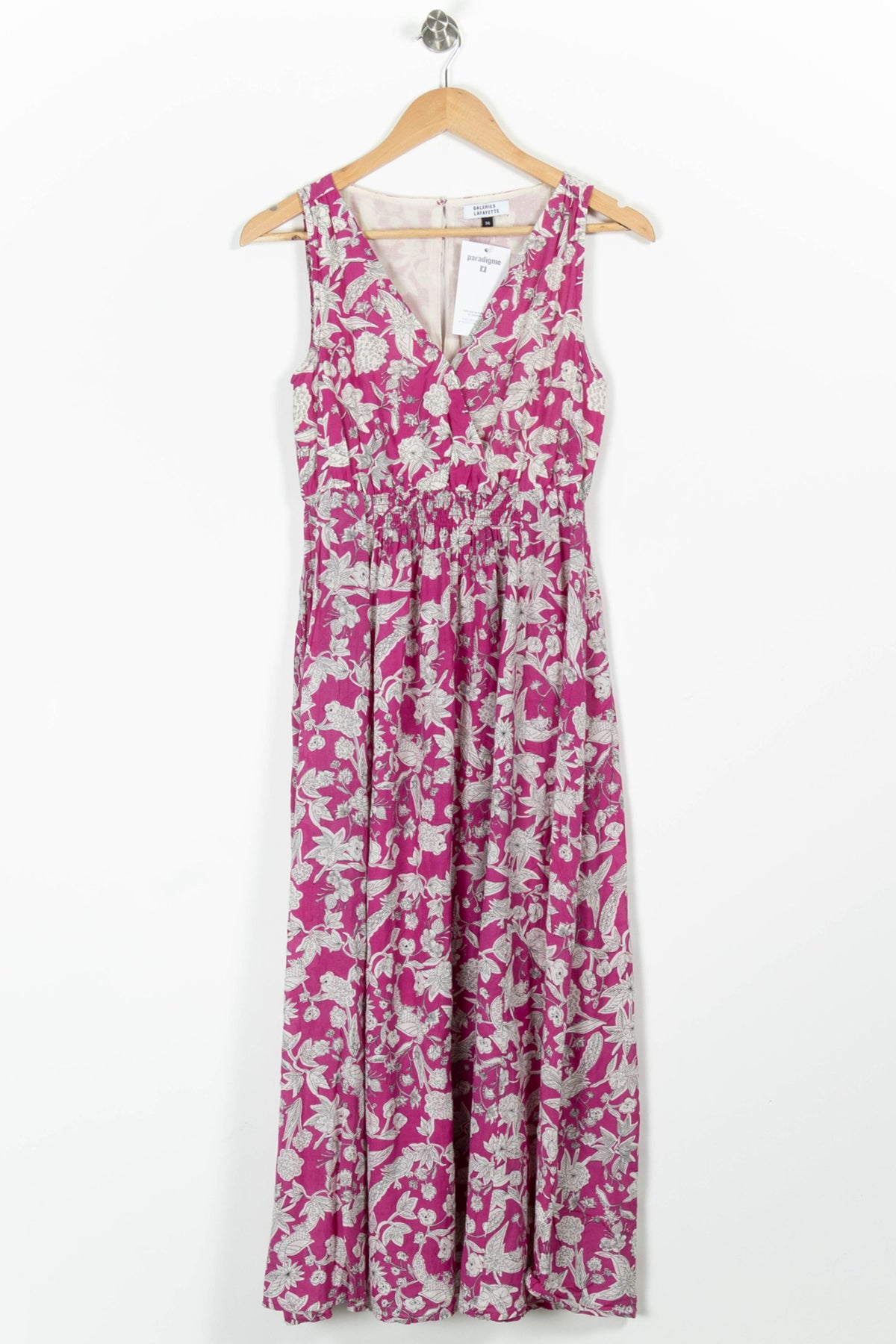 Robe longue fleurie Galeries Lafayette, rose, taille S/36, à l’imprimé floral raffiné et coupe sans manches. Confectionnée en 59,3 % viscose et 40,7 % coton, elle se distingue par sa matière légère et naturelle, une taille élastiquée qui sublime la silhouette et un joli décolleté en V pour une allure féminine. Ce modèle élégant est idéal pour une garden-party estivale ou une sortie en ville lors des beaux jours.
